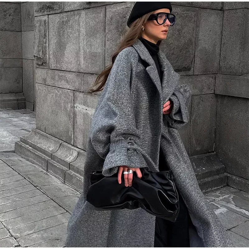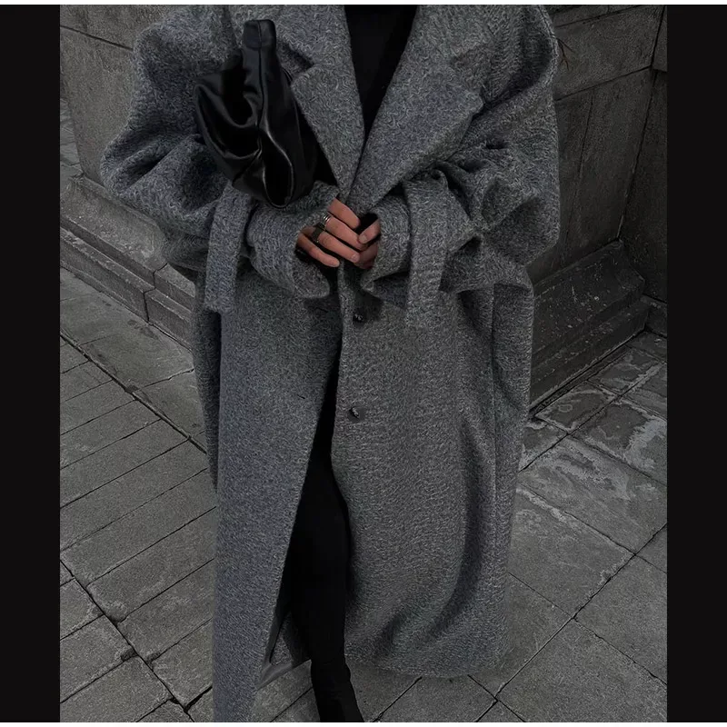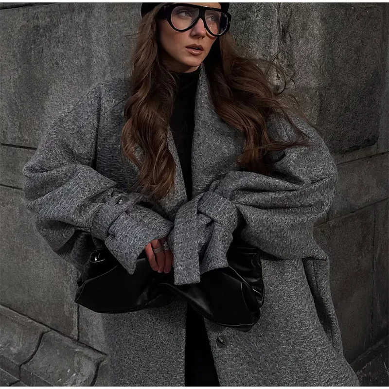 - Silhouette: Oversized cocoon cut; longline hem; sculptural sleeves; notched lapels