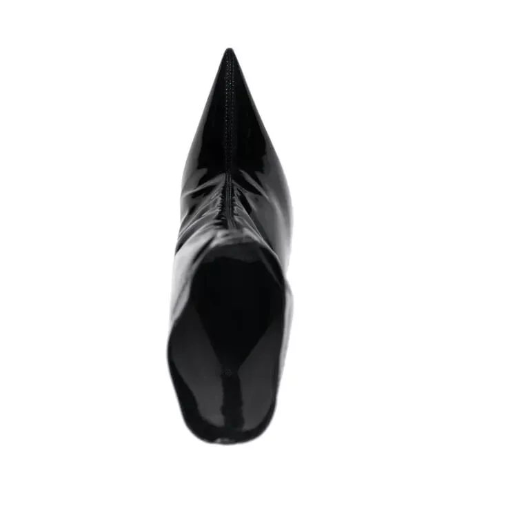 Step into the spotlight with the patent high-stiletto ankle boots, a stunning blend of modern artistry and unapologetic glamour. These boots showcase a glossy black patent finish, radiating a high-shine brilliance that makes an undeniable statement. The sharply pointed toe adds a refined elegance, while the dramatic stiletto heel, crafted in sleek metallic silver, lends a contemporary edge that redefines sophistication.