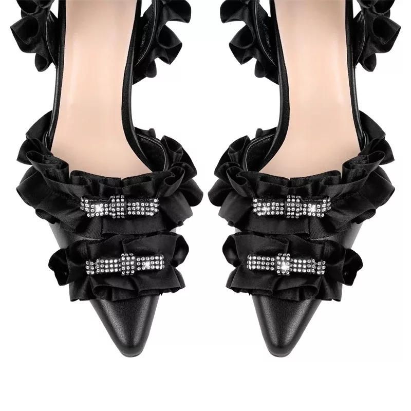 Stylish pleated black high heels with a chic bow and ankle strap. Perfect for adding elegance to any look.