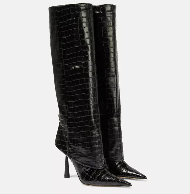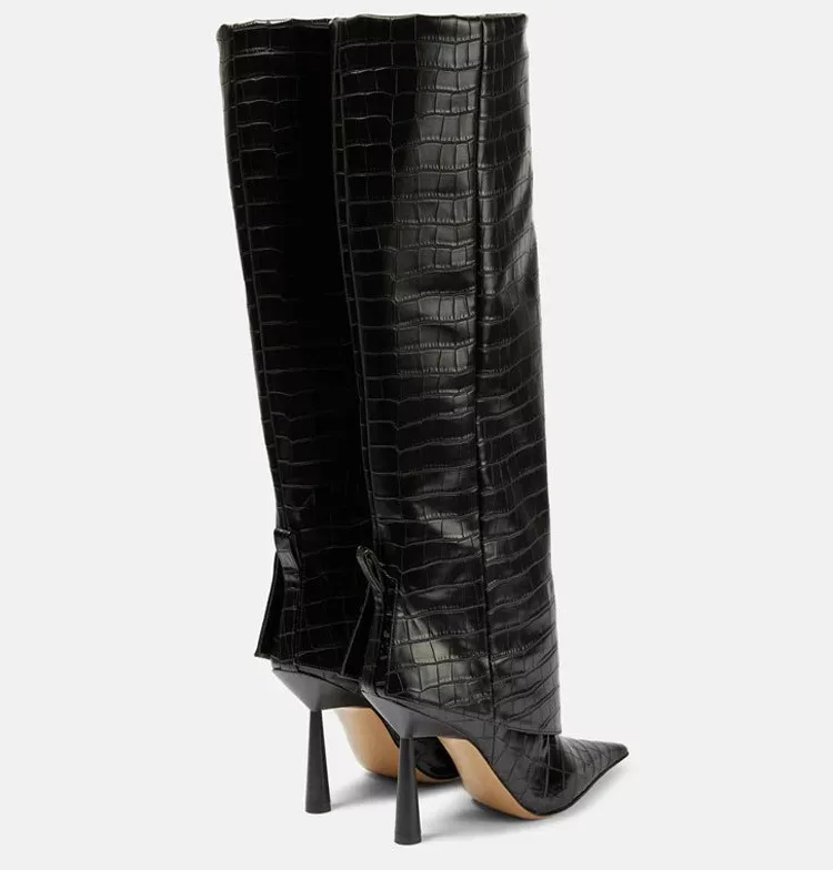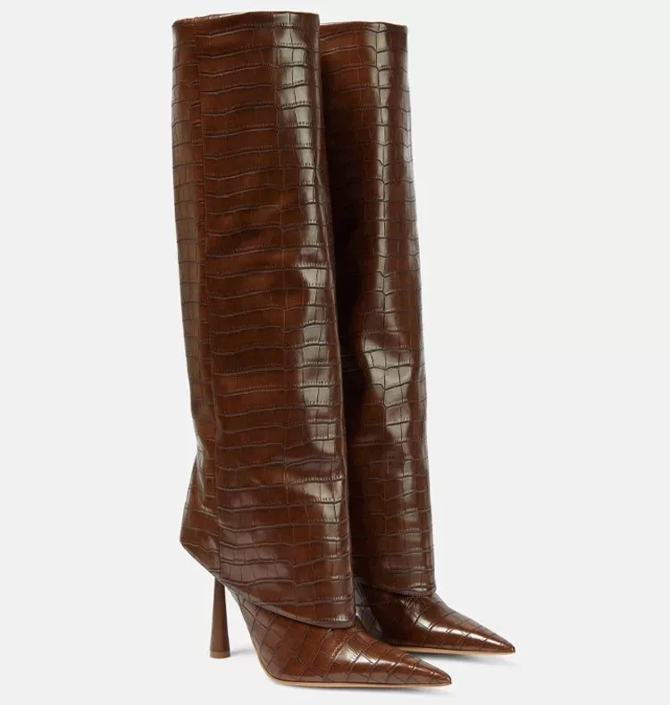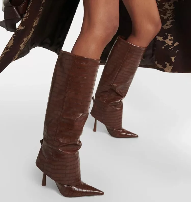 Elevate your style with these Leather Fold Over Pointed Toe Knee-High Stiletto Boots, a must-have for those who seek both sophistication and modern edge. Crafted from luxurious leather, these boots are designed with a sleek pointed toe that elongates the leg, offering a sharp, polished look that’s perfect for any occasion. The fold over design adds a unique touch of elegance, while the stiletto heel enhances your silhouette with a boost of confidence.