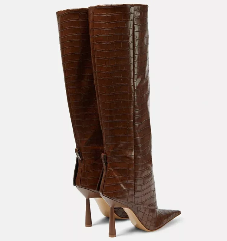 Elegant leather knee-high boots with pointed toes and stiletto heels, available in black and brown.