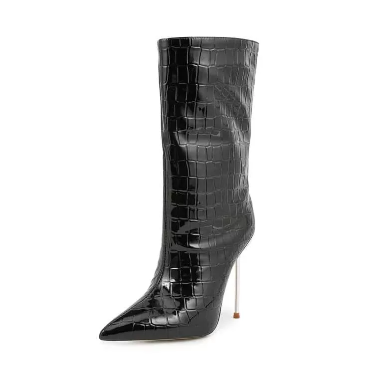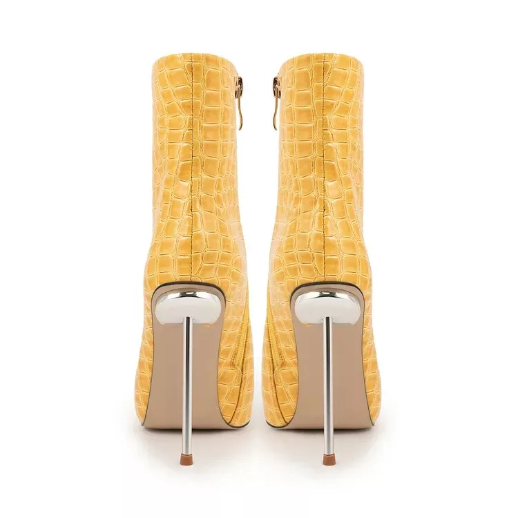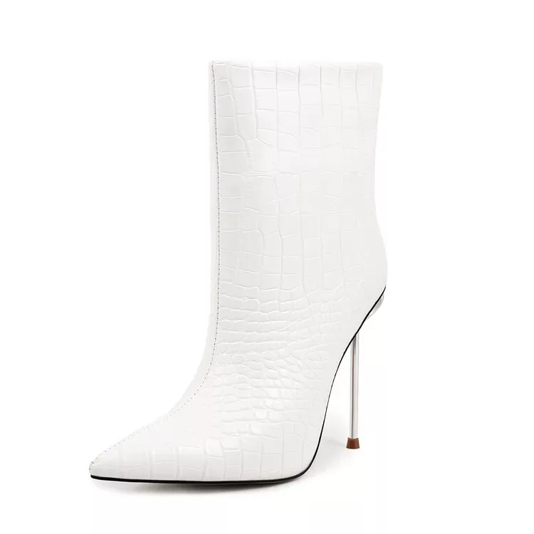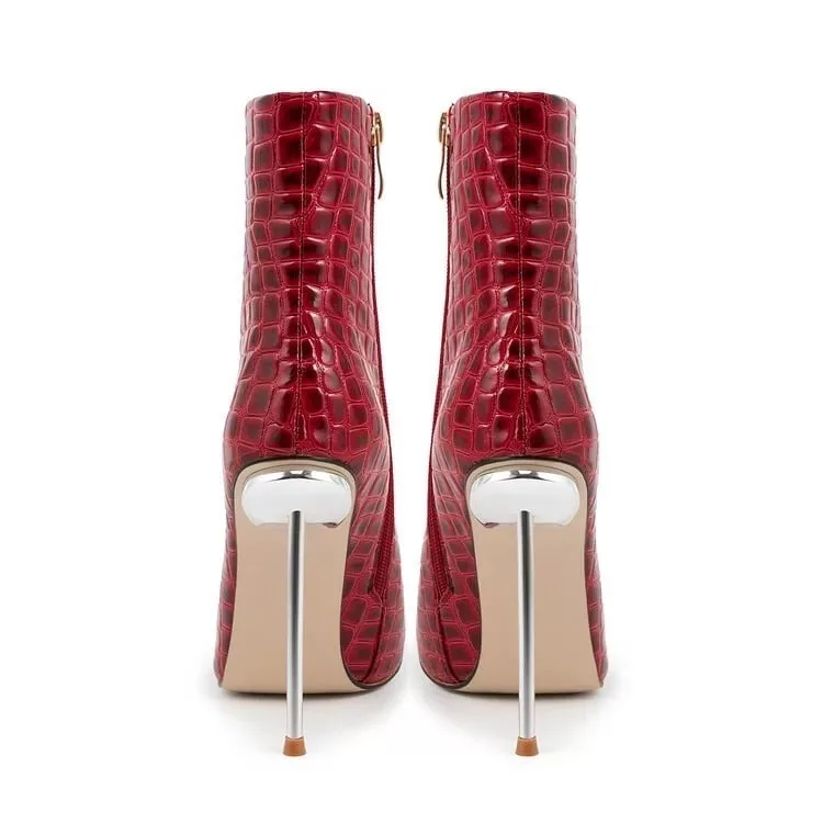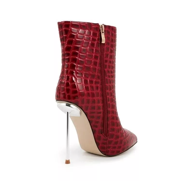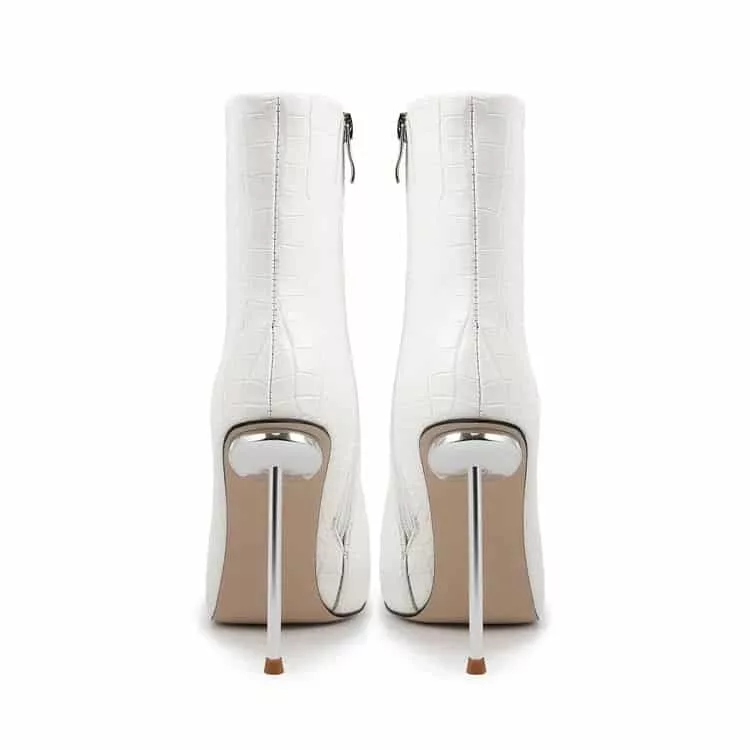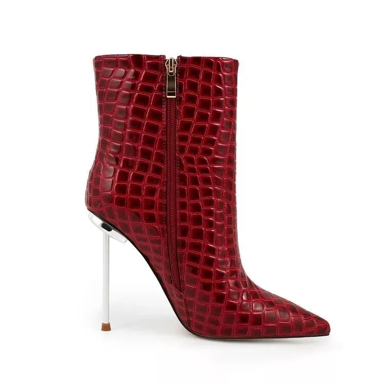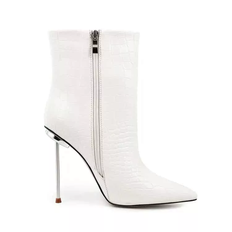 Pointed croc skin ankle boots with thin metal heel, available in black, bordeaux, white, and yellow for a chic statement.