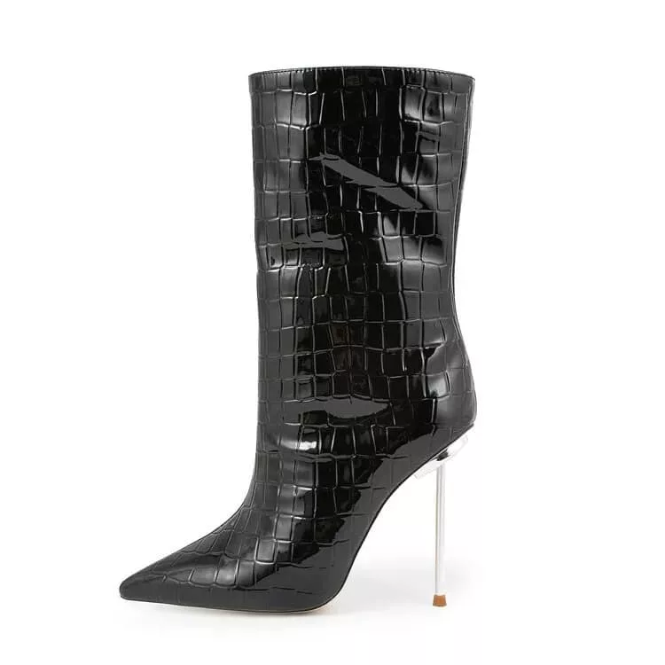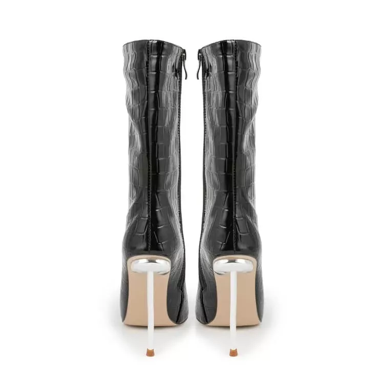 Make a bold statement with the Pointed Toe Croc Ankle Boots, designed for those who appreciate luxury and sophistication. These exquisite ankle boots are crafted from high-quality crocodile skin vinyl, offering a textured and eye-catching appearance. The pointed toe adds a sleek, modern edge, while the thin high metal heel elevates your style with a refined touch, perfect for any chic ensemble.