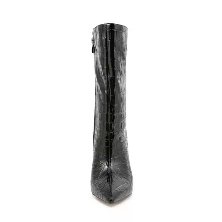 The zip closure ensures easy wear, and the premium vinyl material provides durability, ensuring these Pointed Toe Croc Ankle Boots remain a standout piece in your wardrobe for seasons to come. Their unique combination of materials and design elements makes them perfect for anyone looking to make a lasting impression.
