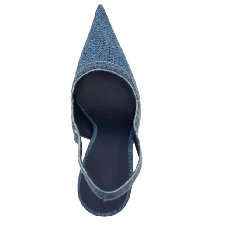 Denim slingback pumps with thin metal heels, perfect for elevating any look with a bold yet elegant edge.