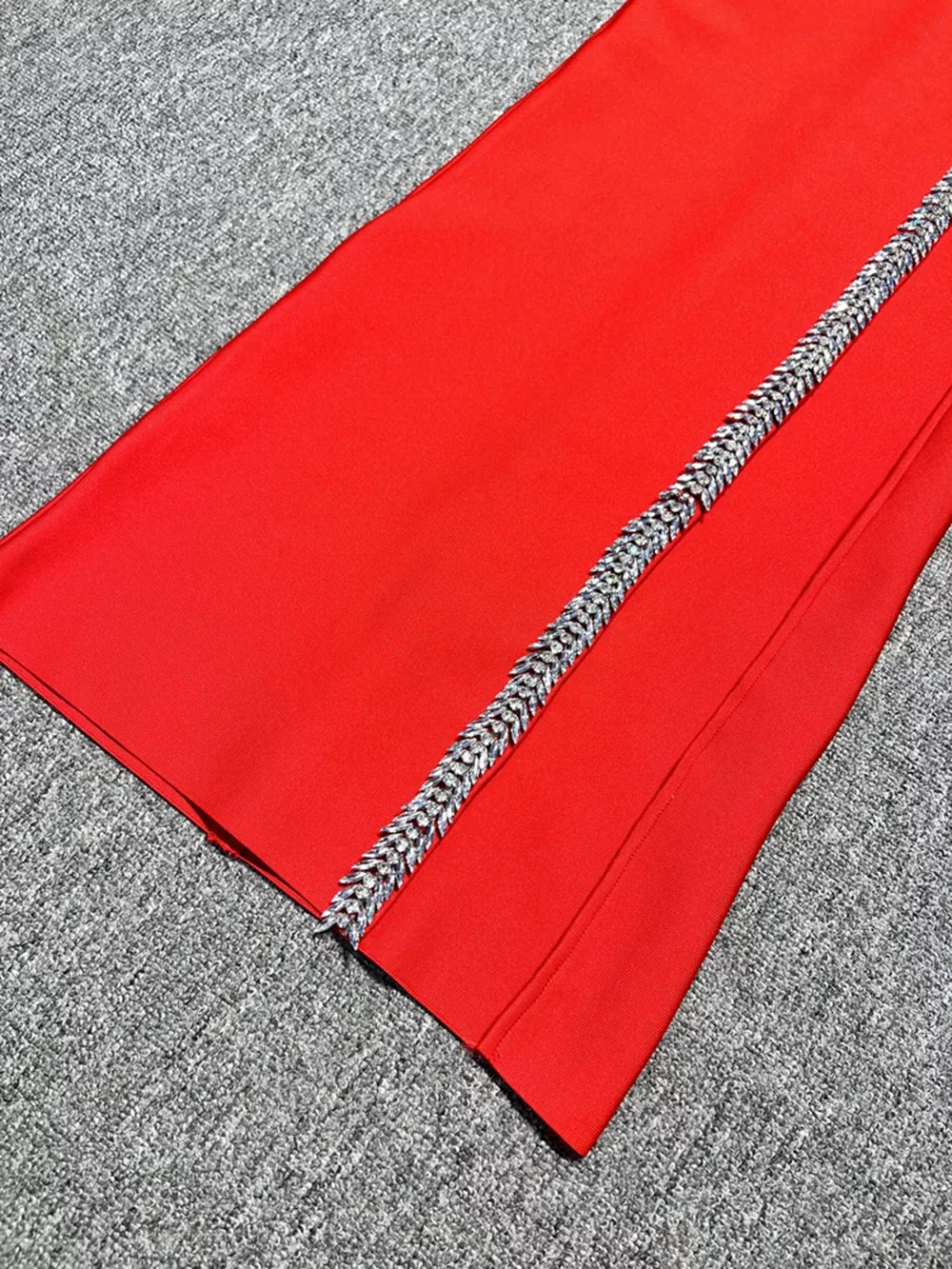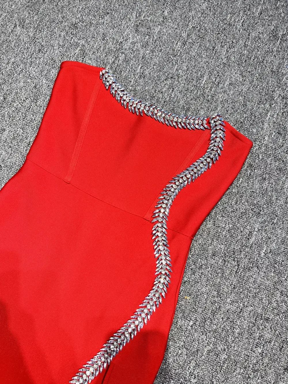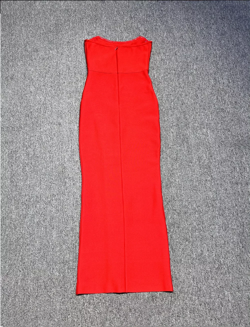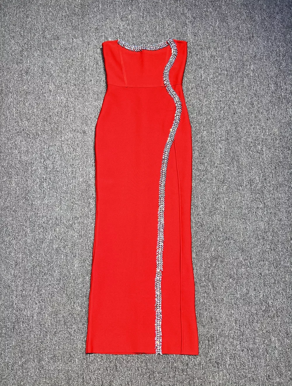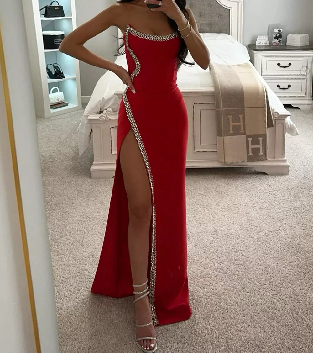 A daring red strapless bodycon dress with a high split, perfect for a chic and glamorous evening.