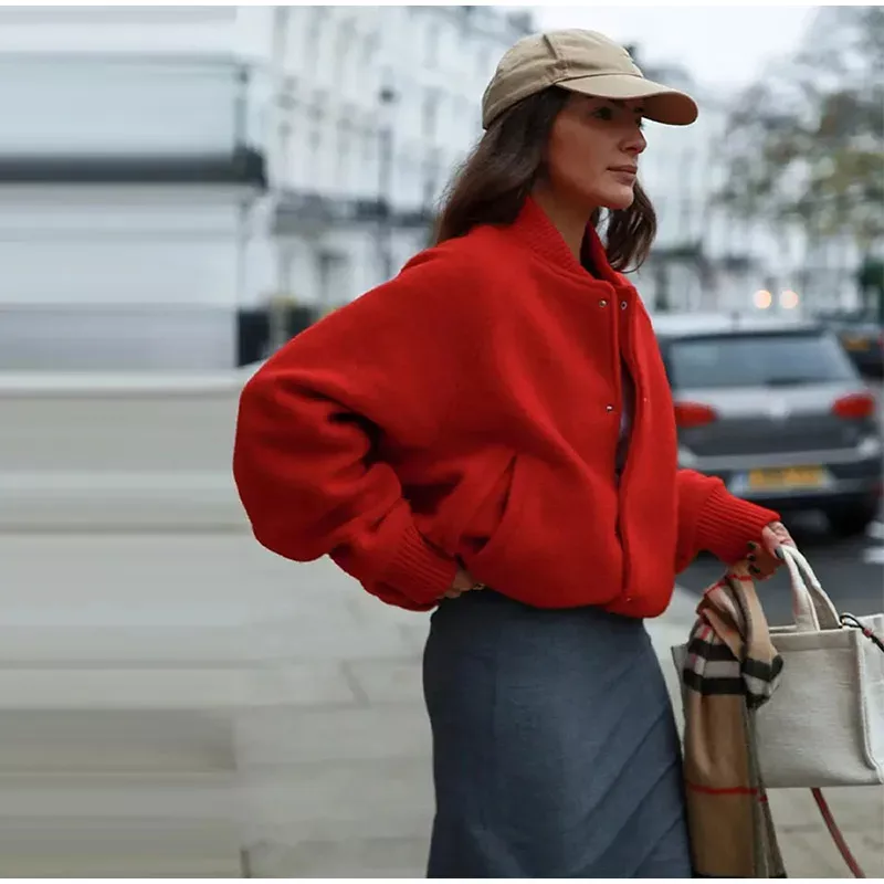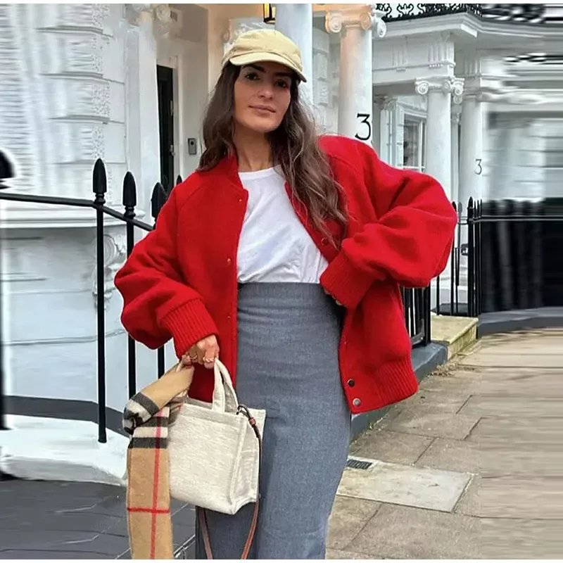Whether you’re heading out for a day of shopping, a casual meetup, or just need a warm yet fashionable jacket, this red varsity bomber promises to be a reliable addition to your wardrobe. Styled with neutral accessories, this jacket can easily elevate your outfit, giving it a modern, urban touch.
