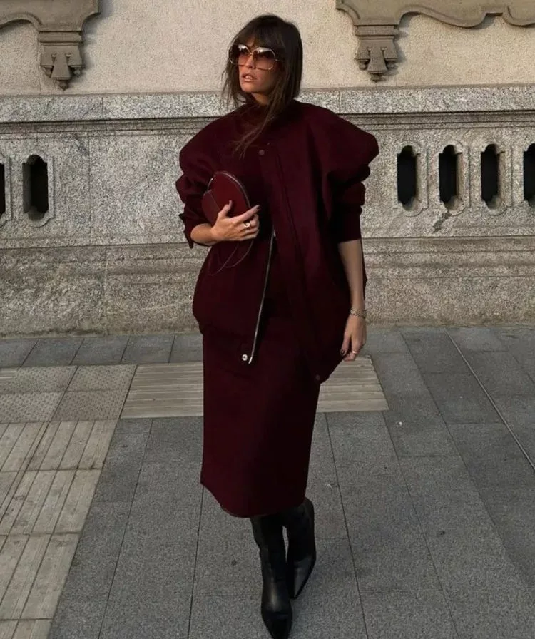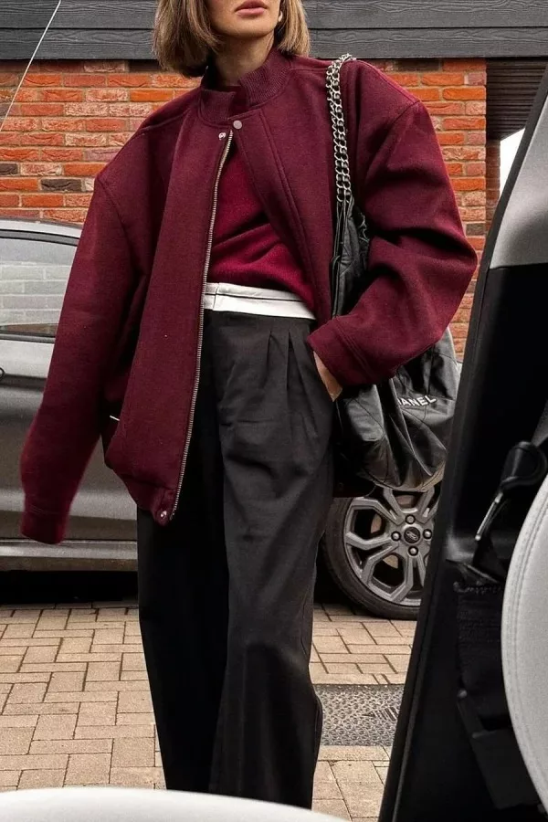 A woolen baseball jacket with puff sleeves and zipper closure, blending comfort with casual sophistication.