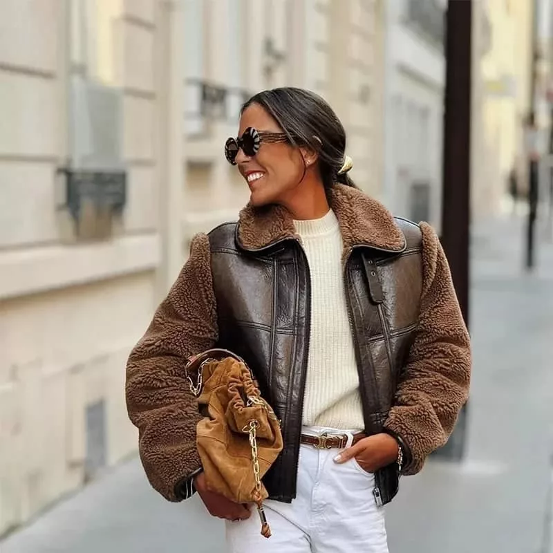 Whether paired with distressed jeans for an effortlessly chic daytime look or layered over a sleek turtleneck for a polished evening outfit, this jacket is your go-to for versatile winter styling. Its combination of rugged leather and plush shearling creates a striking contrast, ensuring you’ll stand out in any setting.