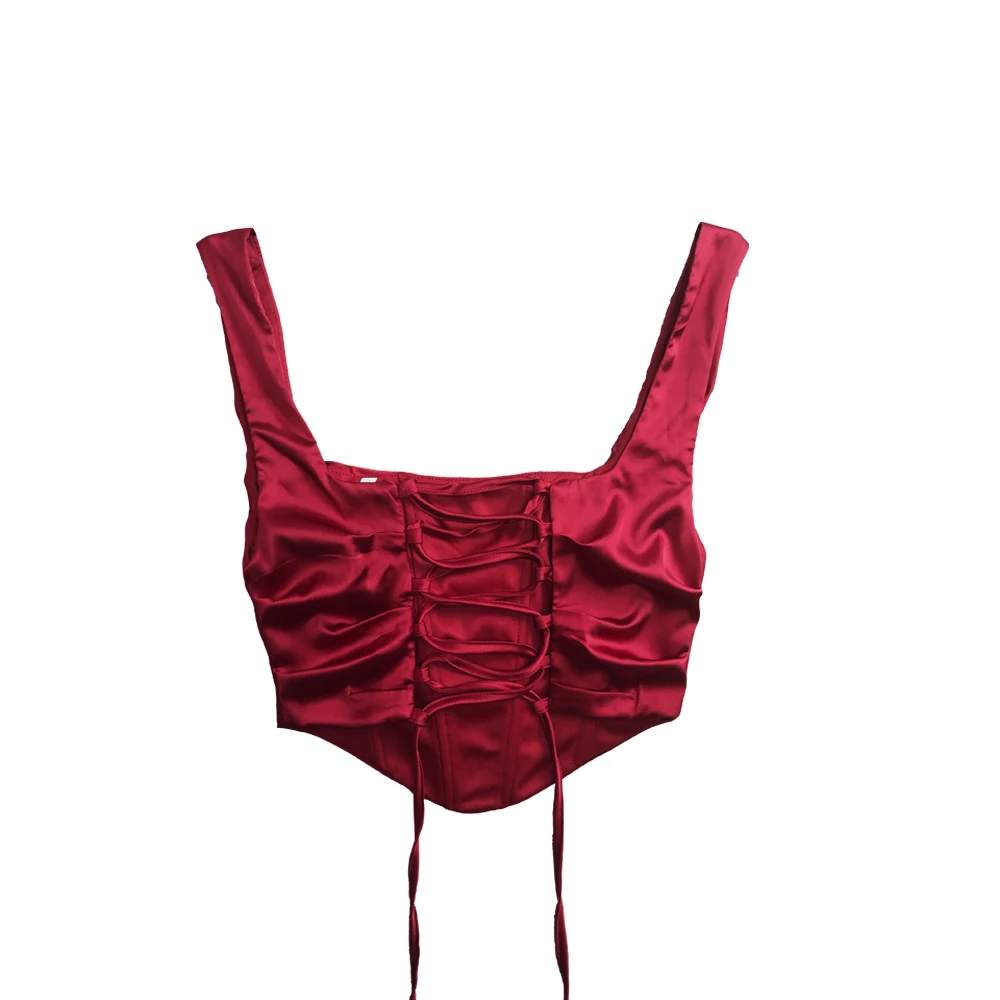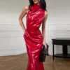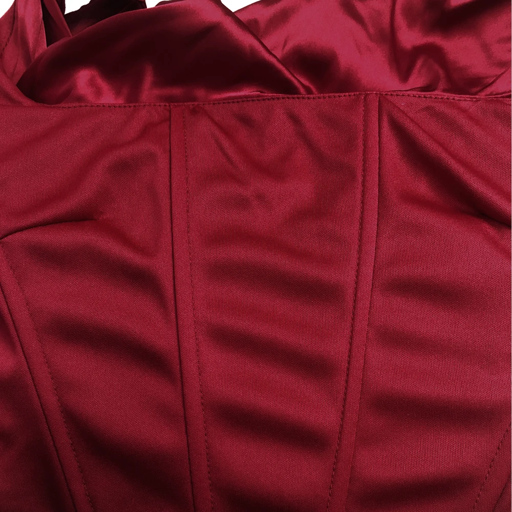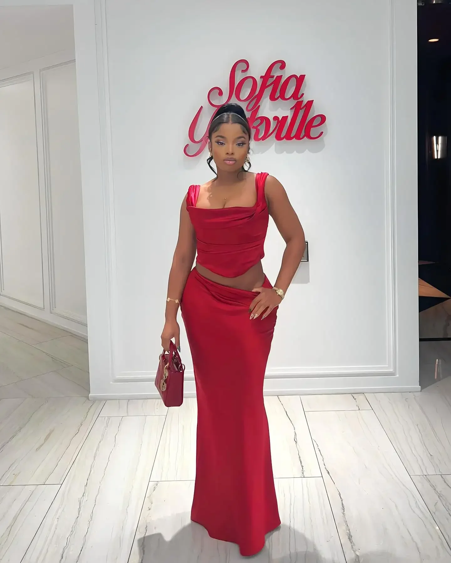 A sleek deep red satin two-piece set featuring a draped cowl neck top with lace-up back and a floor-grazing maxi skirt. Sophisticated, sensual, and perfect for evening allure.