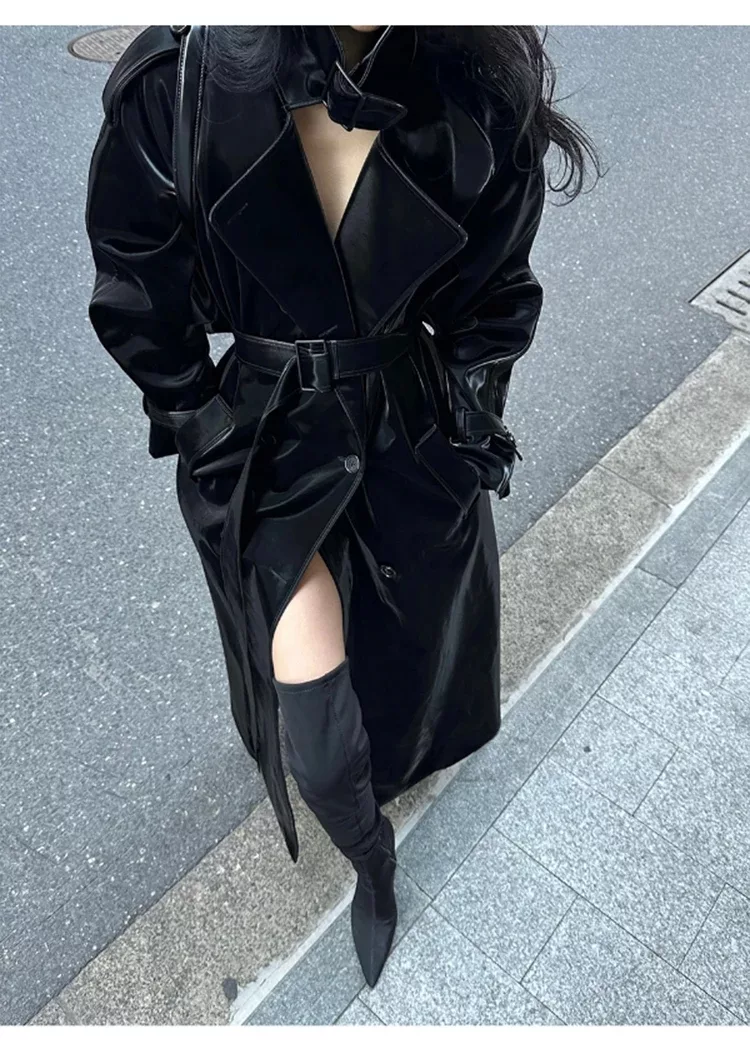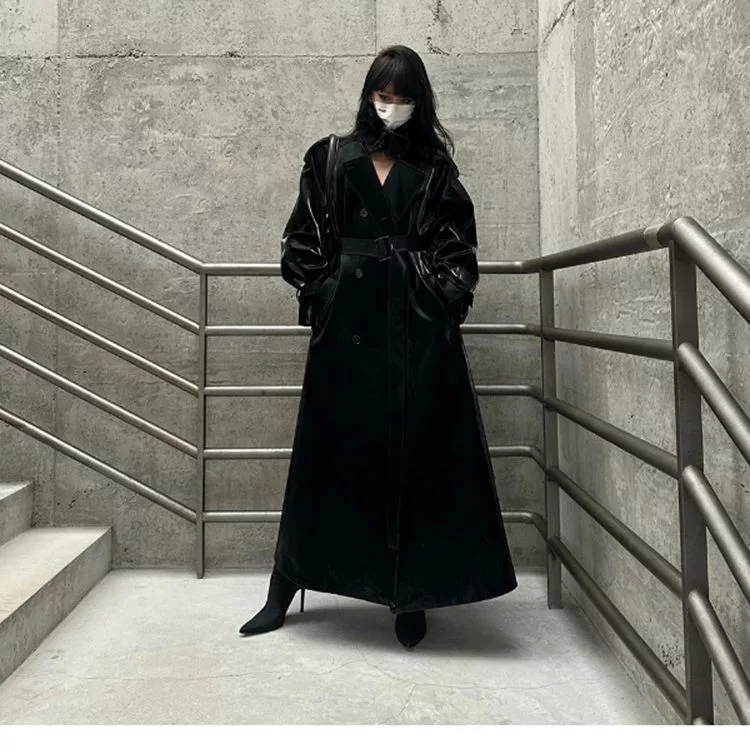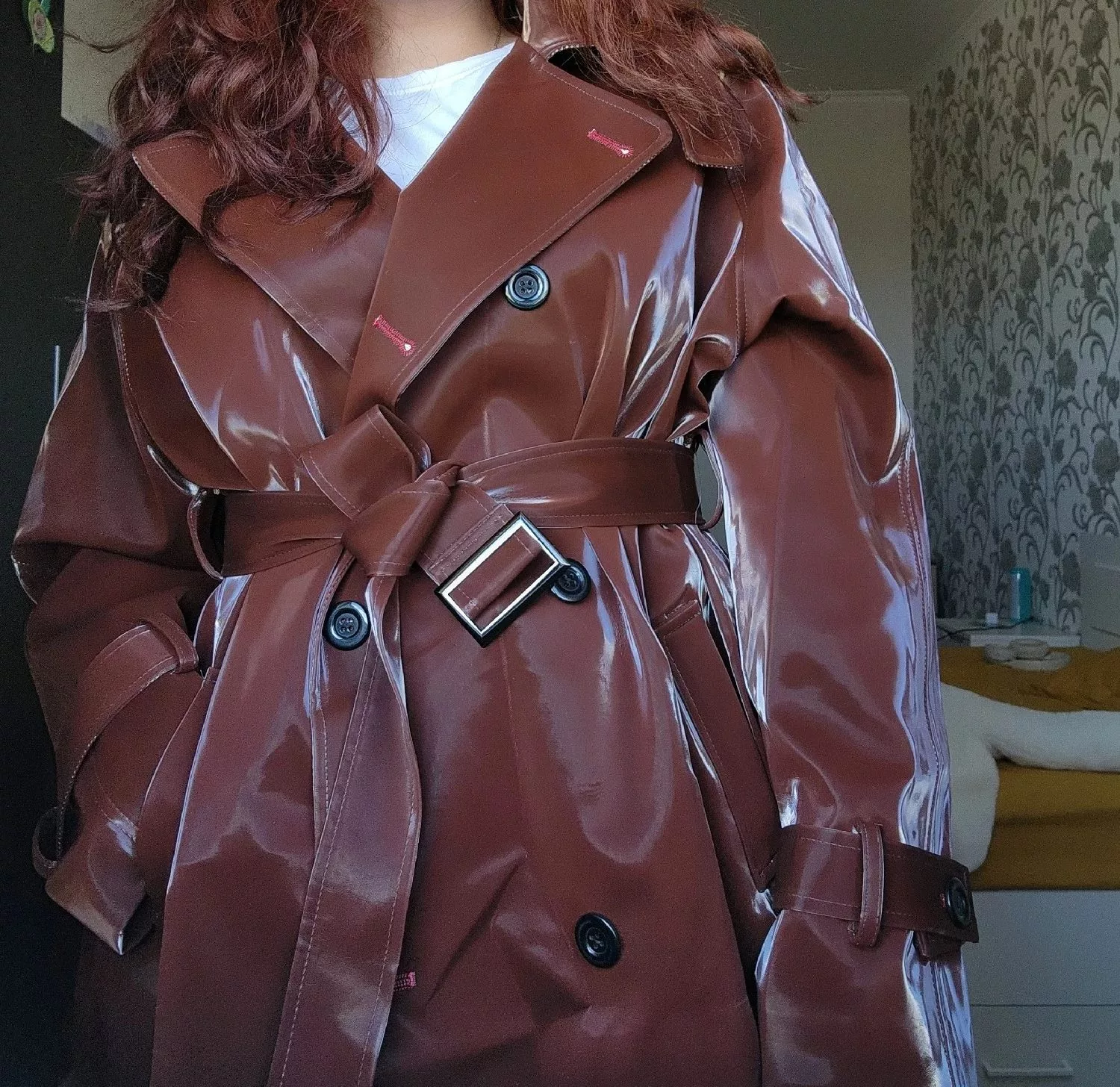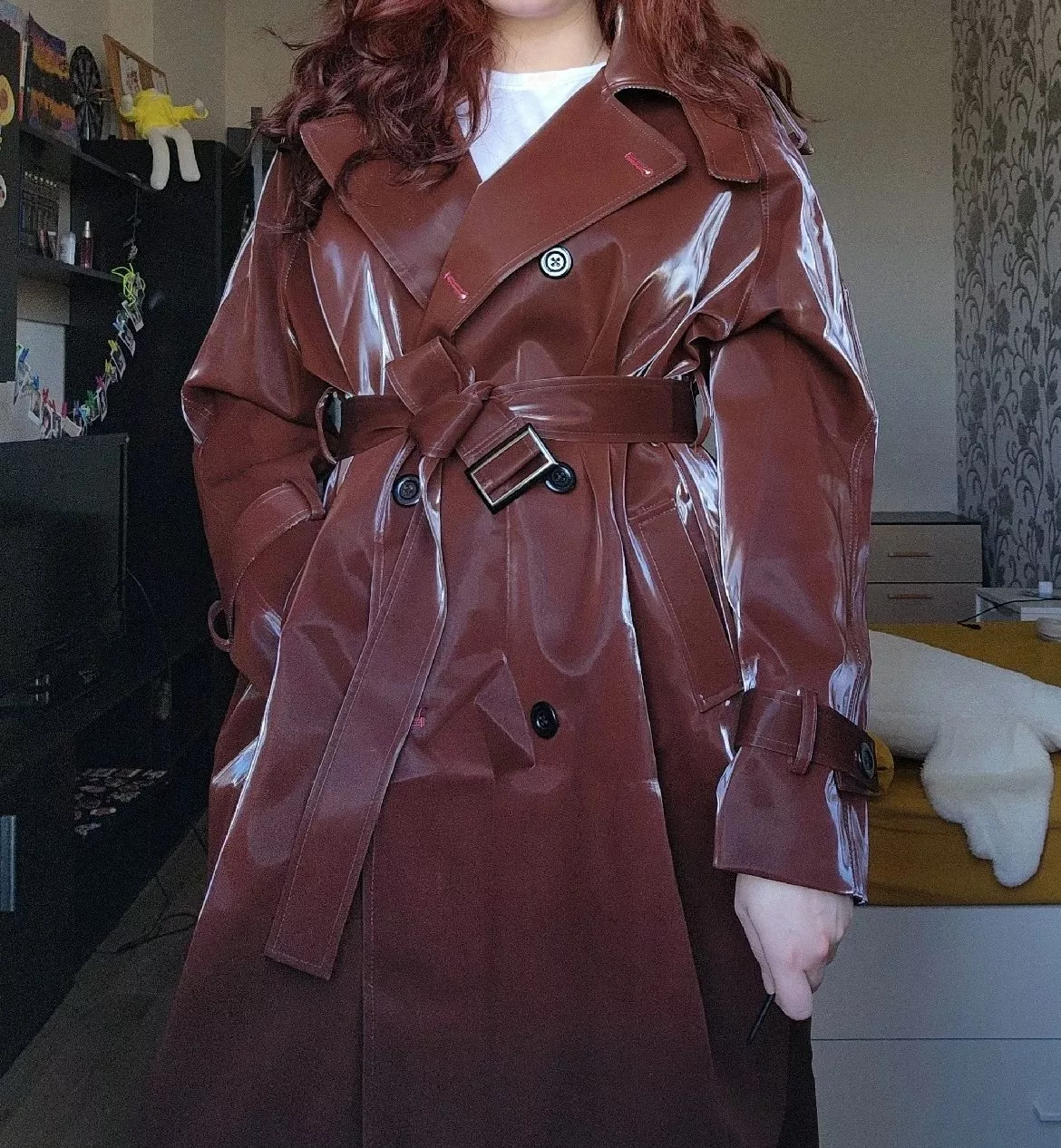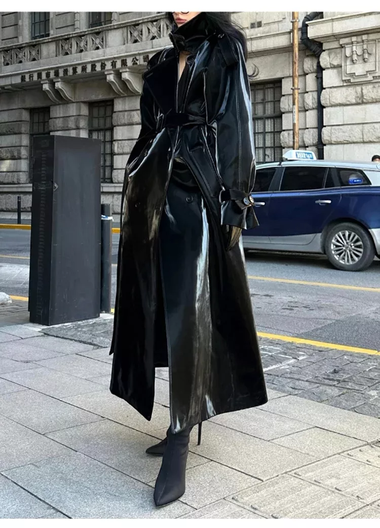 Turn heads and embrace elegance with the Shiny Patent Leather Trench Coat, a modern statement piece that exudes sleek sophistication. Crafted from high-quality glossy patent leather, this trench coat is designed to deliver both style and functionality, making it an essential addition to your wardrobe. Its streamlined silhouette, accentuated by a flattering belted waist, creates a tailored fit that emphasizes your figure, while its polished finish brings a bold, fashion-forward look to any ensemble.