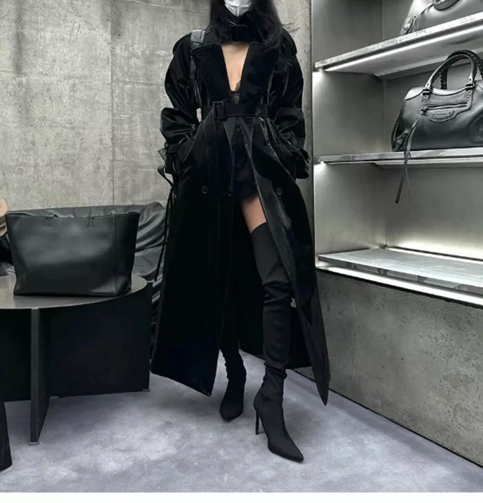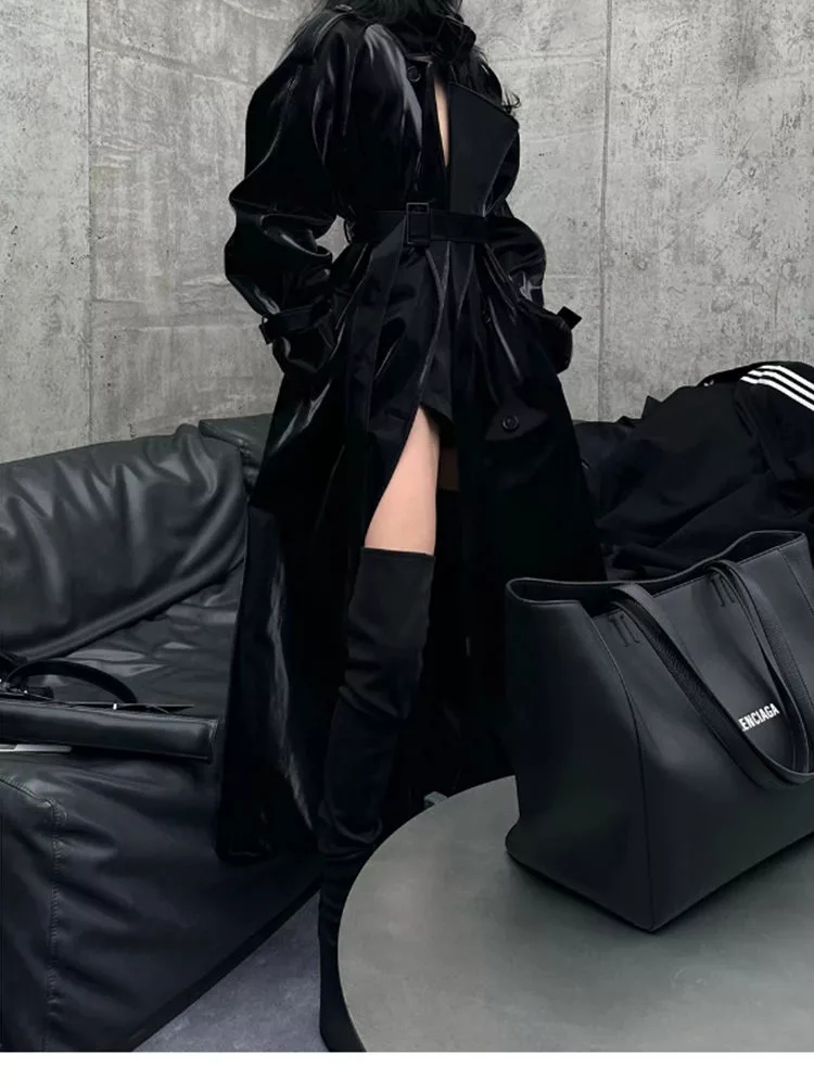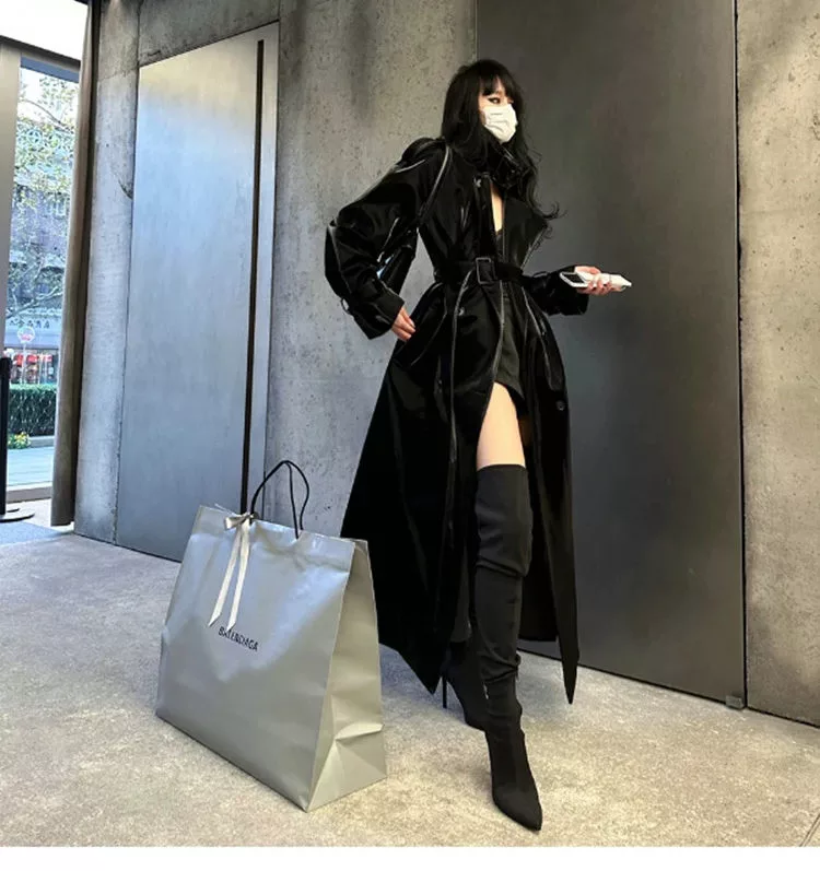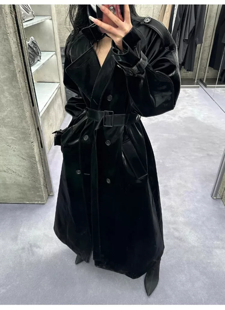 Perfect for transitioning between seasons, the Shiny Patent Leather Trench Coat offers a balance of practicality and opulence. Its glossy surface not only enhances its visual appeal but also provides durability and protection against the elements. From the elegant design to its striking finish, this coat is the ultimate expression of modern glamour with a touch of vintage charm. Pair it with stilettos or heeled boots for a chic evening look, or dress it down with sneakers for a street-style edge.