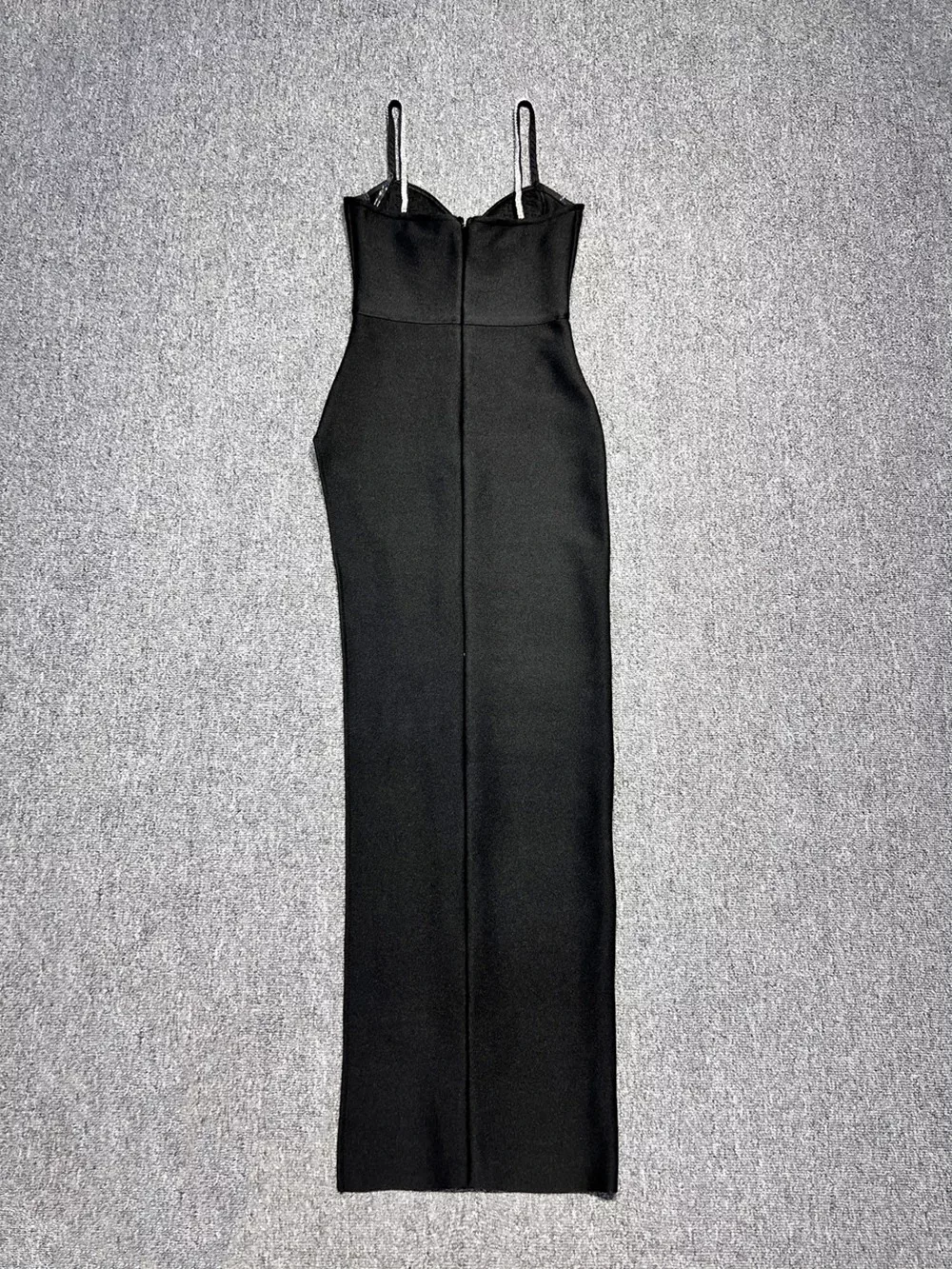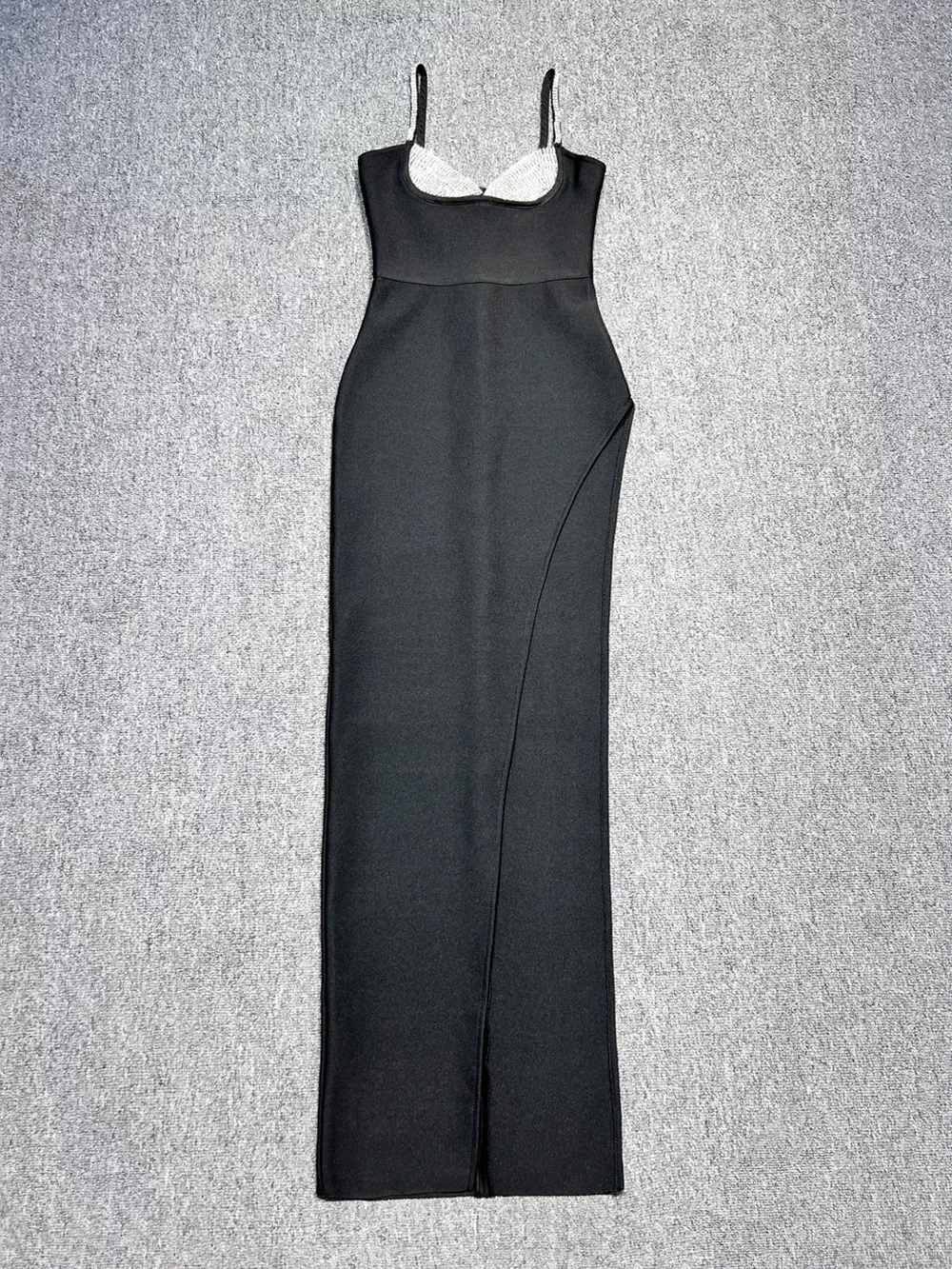Step into the spotlight with this stunning Spaghetti Strap V-Neck Diamond Split Bandage Dress, designed to elevate your evening look with luxurious detail and an unforgettable silhouette. The sleek, body-hugging fabric molds to your curves, offering a flattering fit that exudes confidence. With a classic V-neckline and delicate spaghetti straps, this gown is perfect for making a sophisticated statement at any formal event. The diamond embellishments on the straps and bodice add a touch of shimmer and elegance, catching the light with every movement, while the daring split creates a bold, sultry finish.