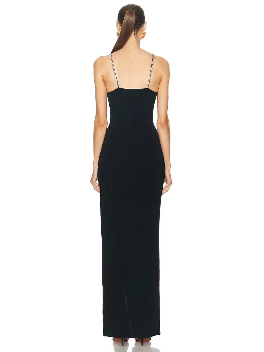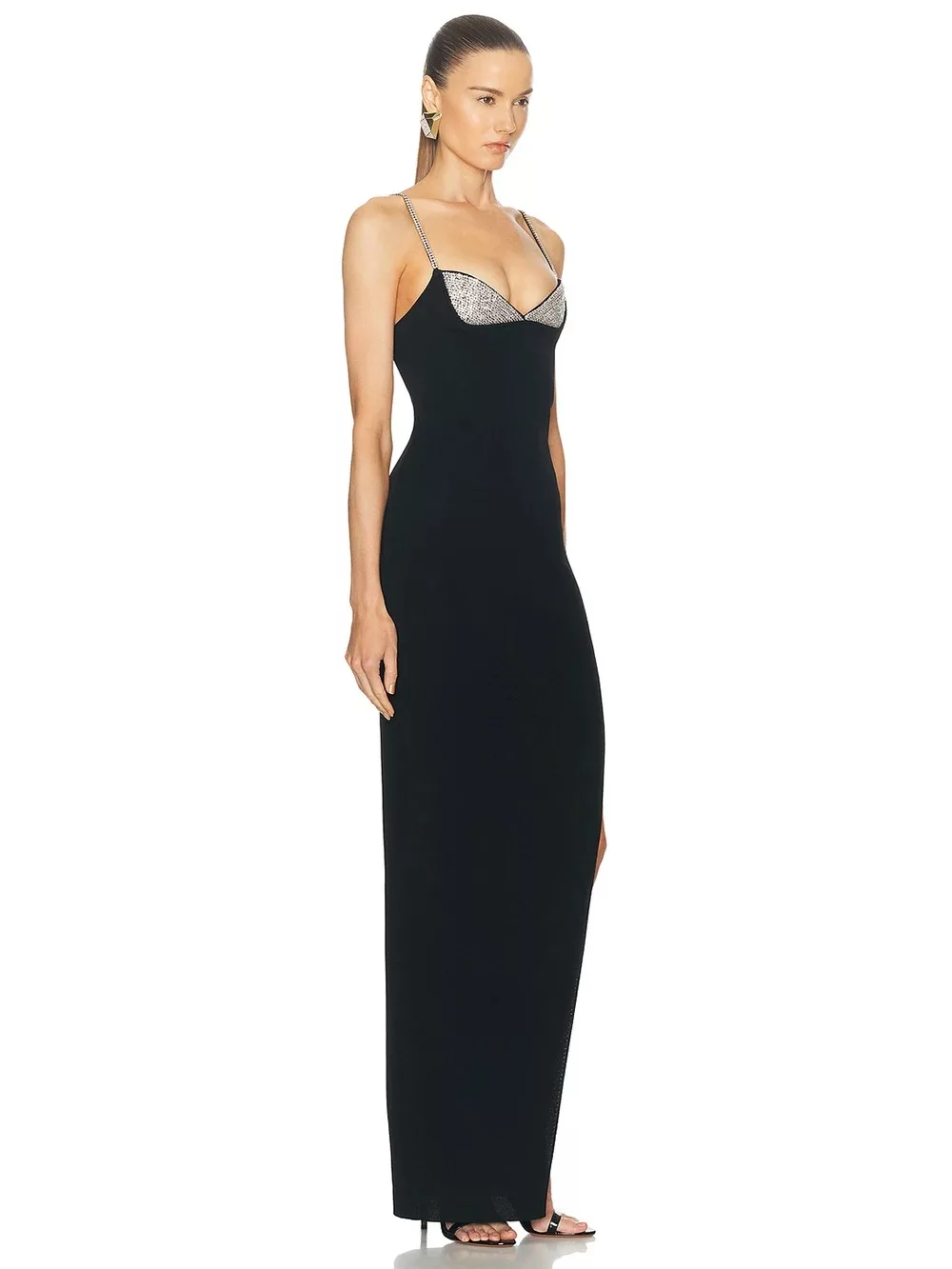 A glamorous bodycon dress with diamond accents, spaghetti straps, and a dramatic split.
