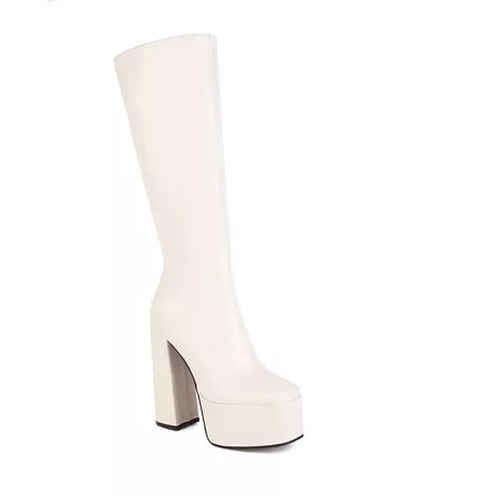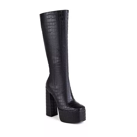 Croc knee-high chunky boots with a square heel and platform for a bold, stylish look. Available in four colors.