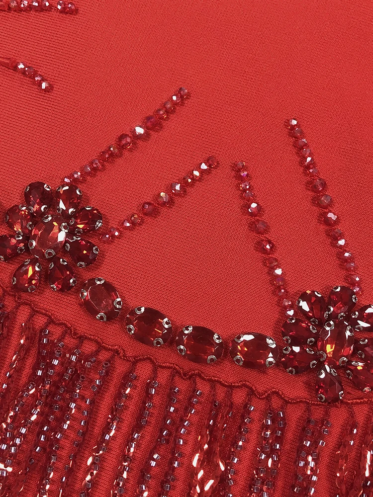 A square neck mini dress with open back and beaded fringe detail, designed with a slim fit silhouette for evening events and social gatherings.