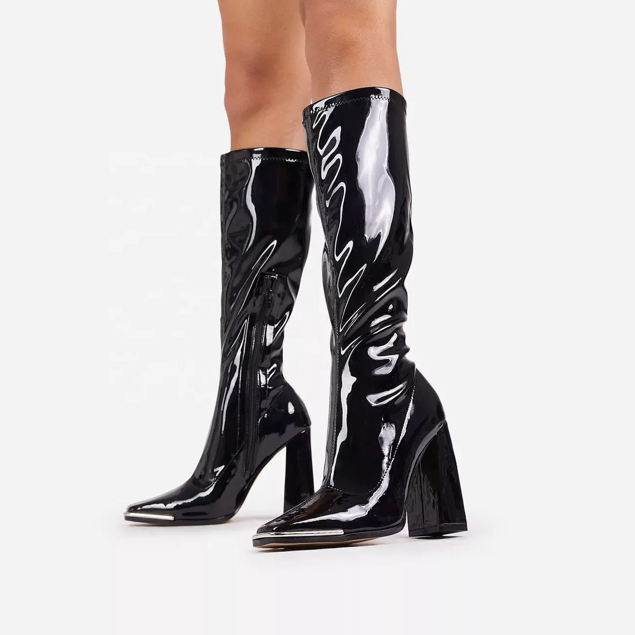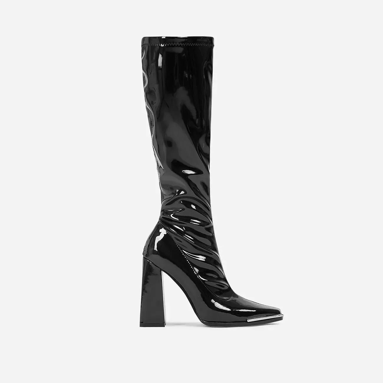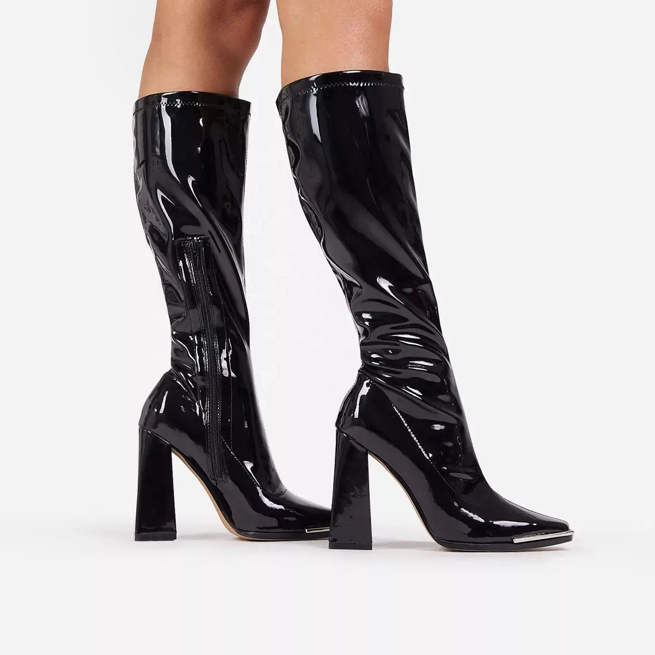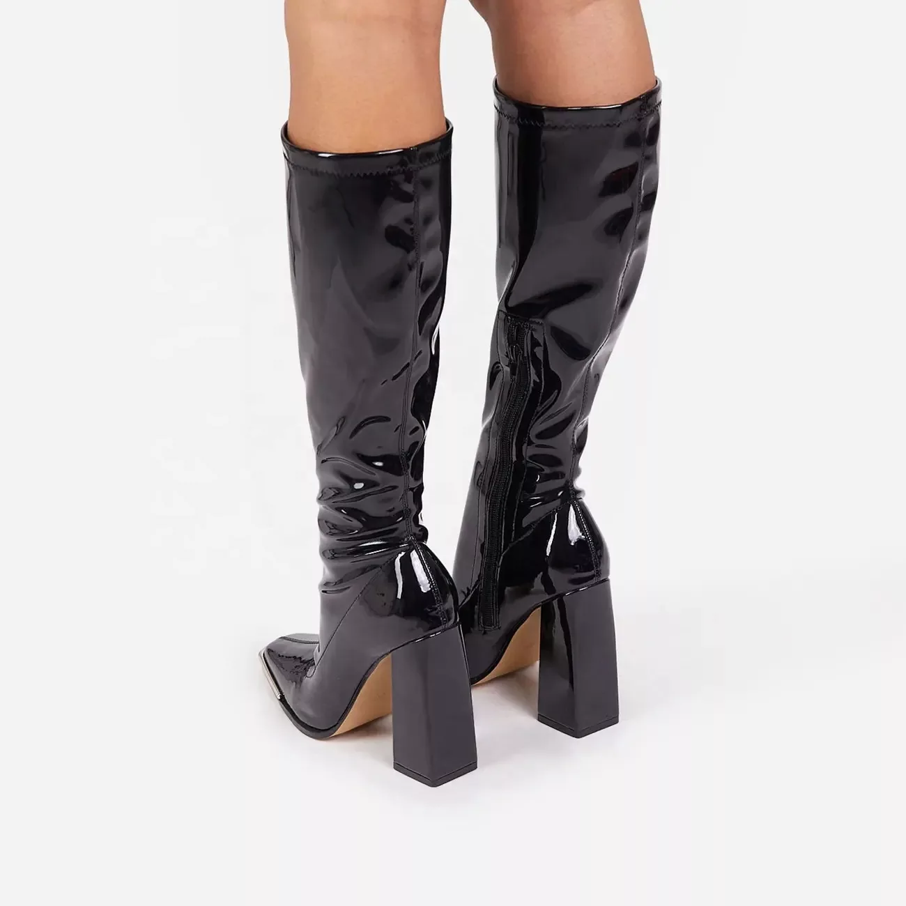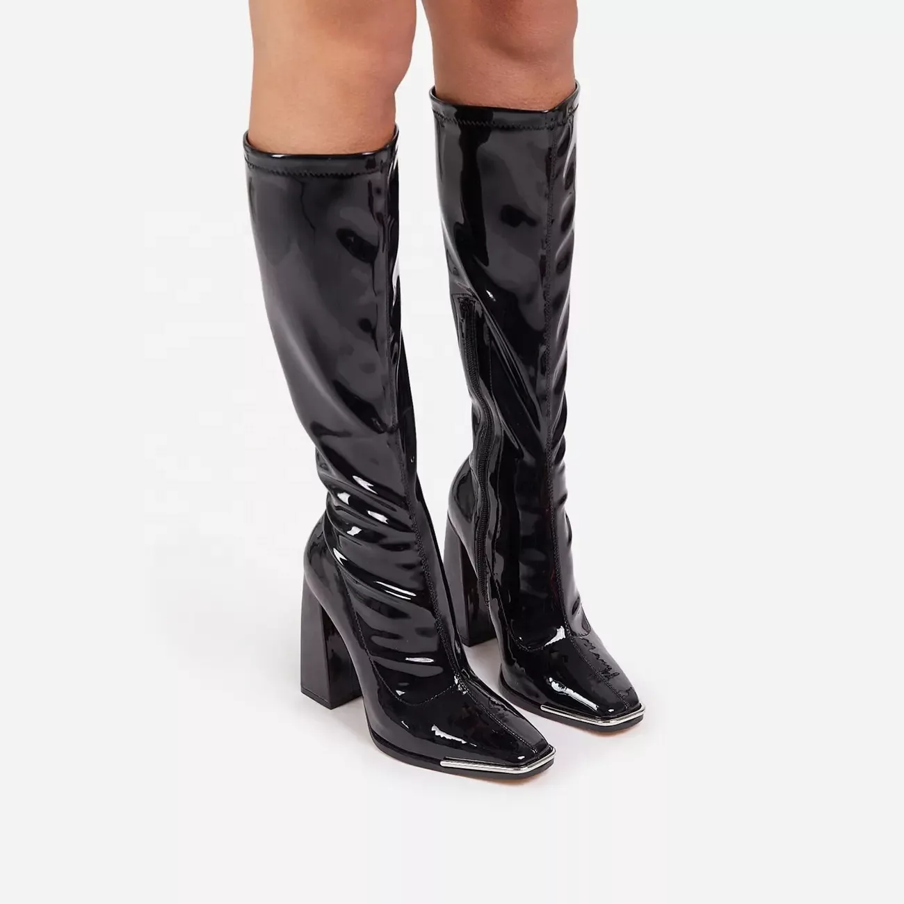 Stylish knee-high square toe boots with chunky heels, available in black and white vinyl for modern luxury.
