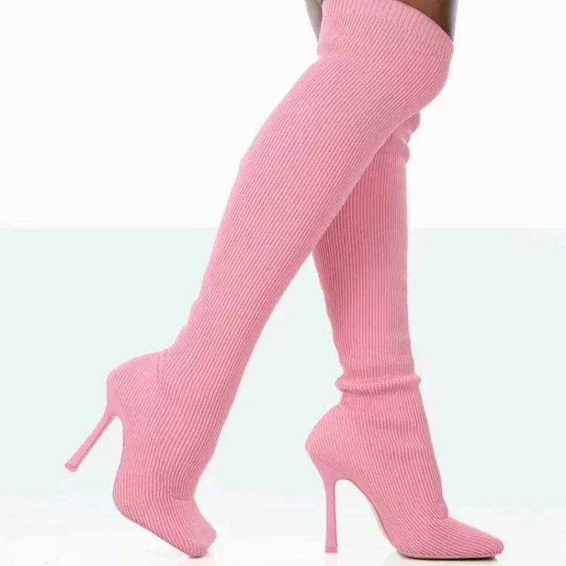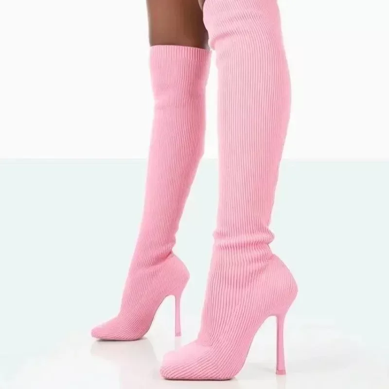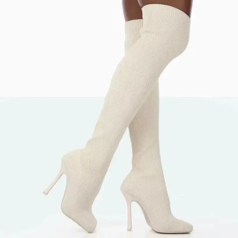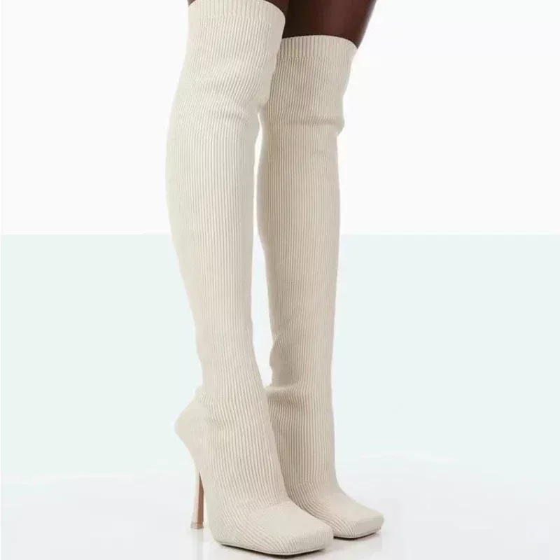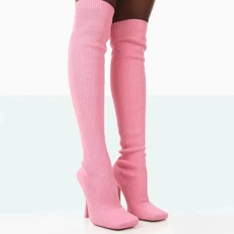 With their unique combination of a square toe and pointed toe design, these long sock boots are sure to stand out from the crowd, adding a distinctive flair to your style. Whether you’re headed to an elegant evening event or simply want to make a bold statement in your everyday look, the Square Toe Knitted Thigh-High Boots offer both style and substance.