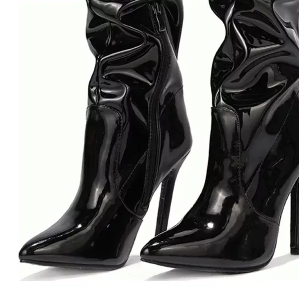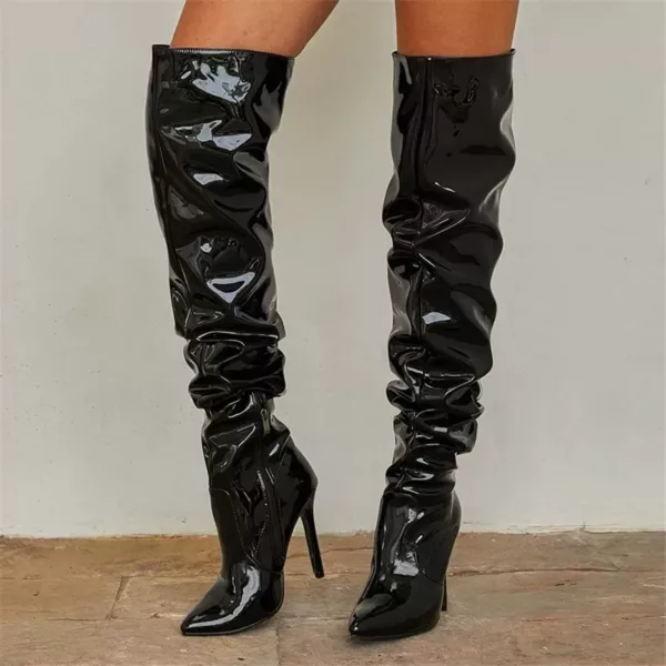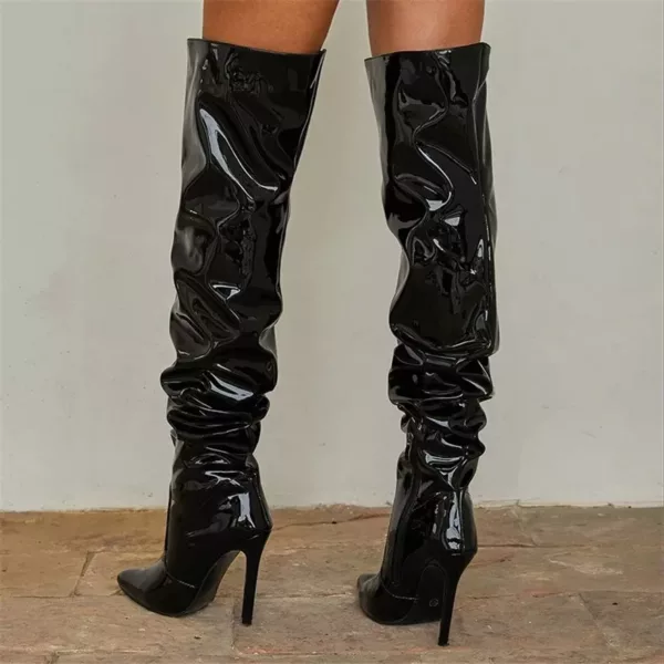 The side zippers ensure a snug, comfortable fit, while the over-the-knee design adds length and elegance to your silhouette. Whether you’re heading to a party, a date night, or a stylish event, these boots will enhance any outfit with a sleek, modern flair. Their patent leather finish reflects luxury, while the stiletto heel offers a sexy edge, making them a must-have for any fashion-forward wardrobe.
