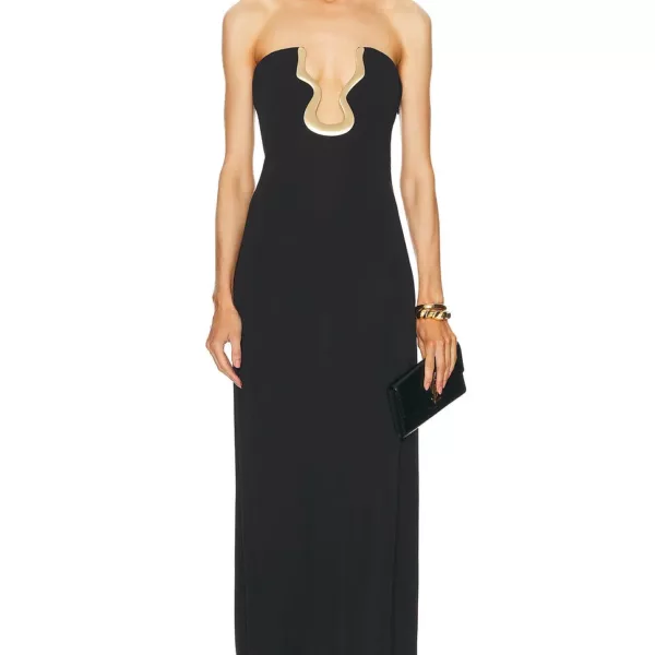 Sleek strapless black gown with a sculptural flame-edged plunge and a figure-hugging fit—perfect for red carpet or runway-level glam.