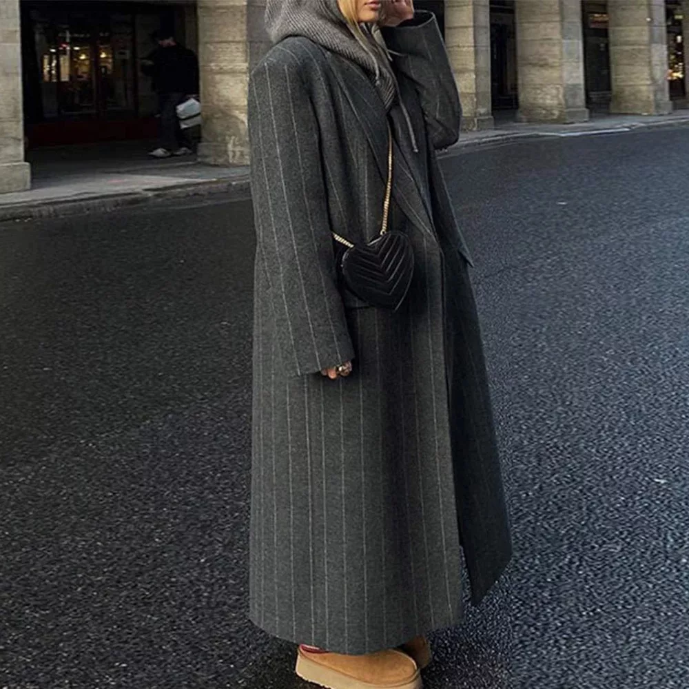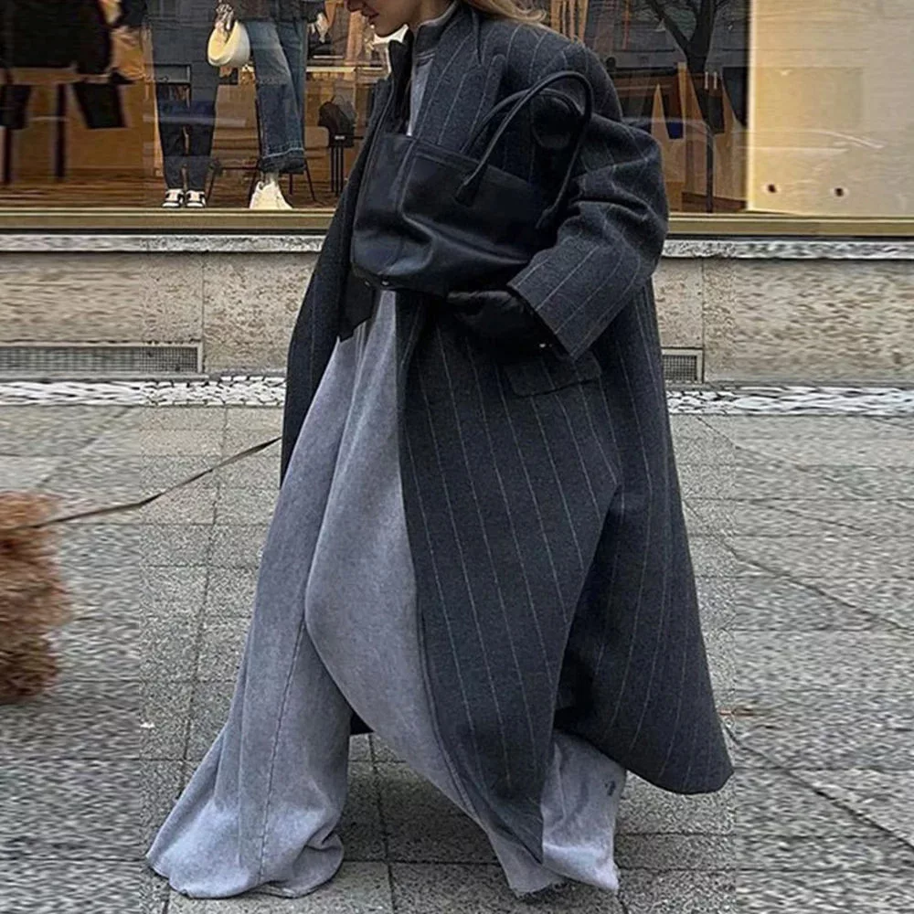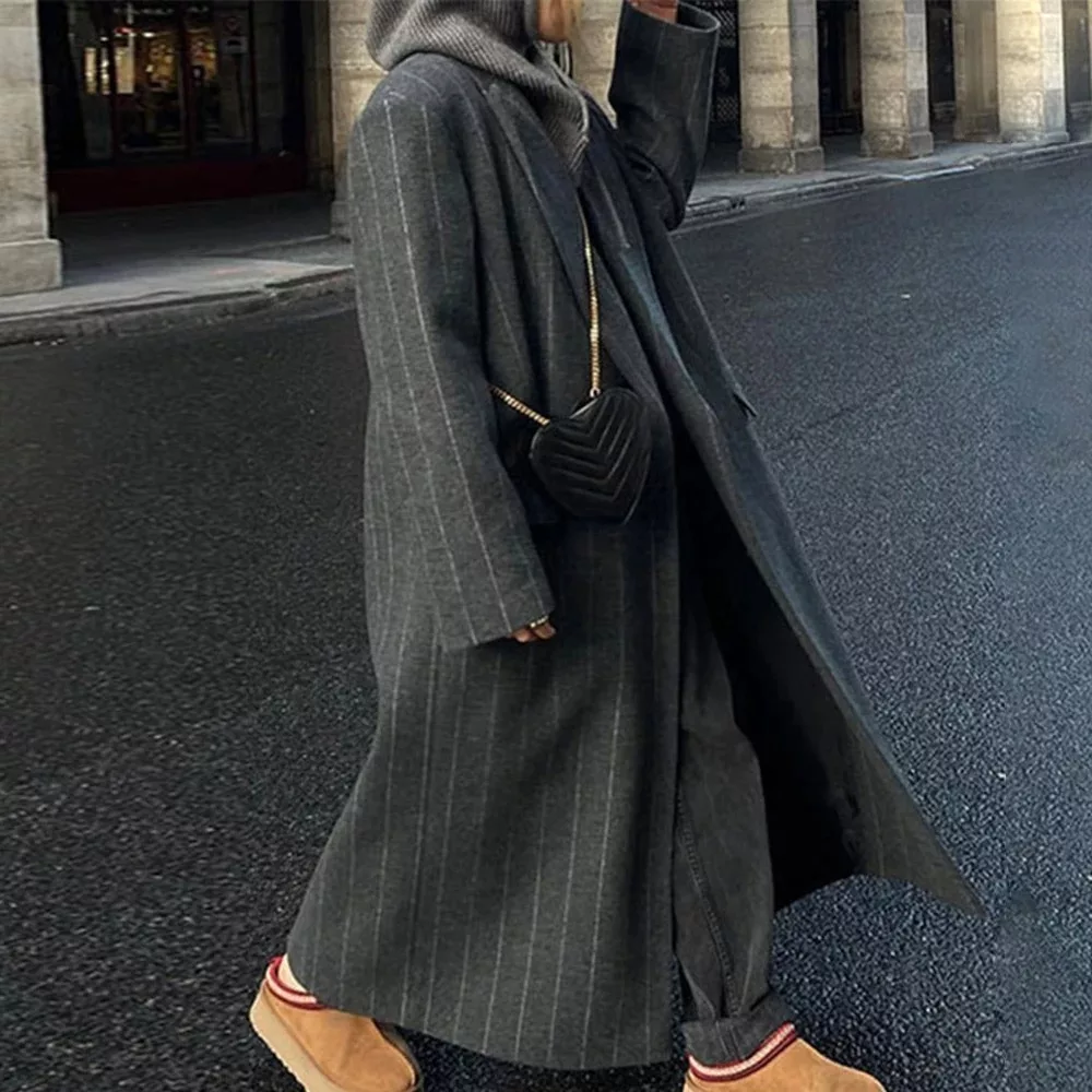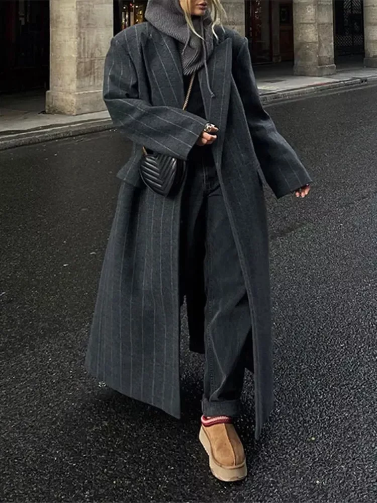 Chic striped long coat with notched collar and patchwork pockets. A fashionable must-have in dark gray.