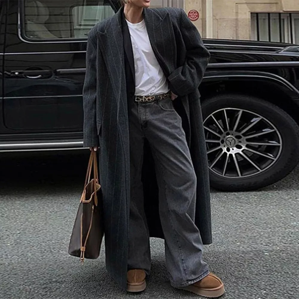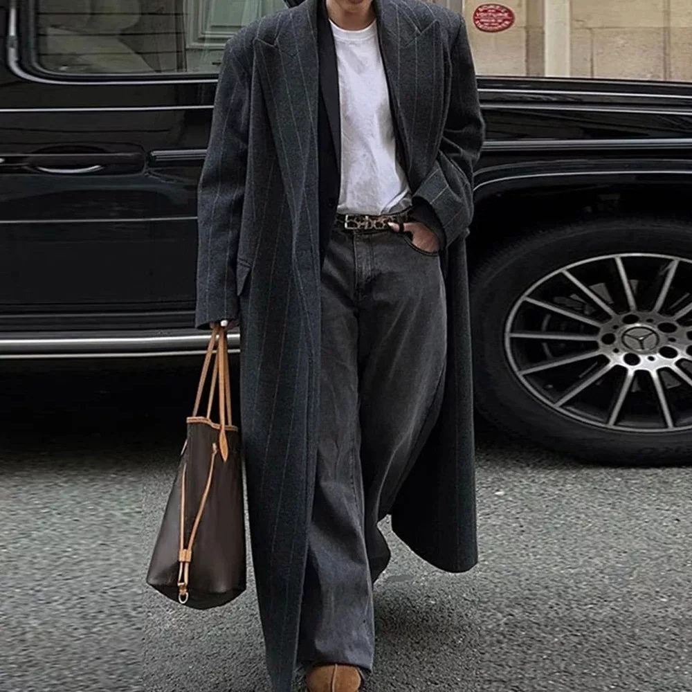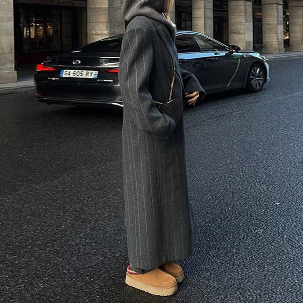 Chic striped long coat with notched collar and patchwork pockets. A fashionable must-have in dark gray.