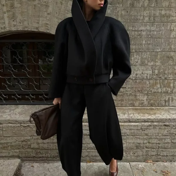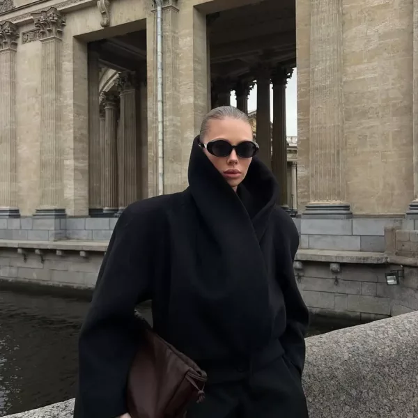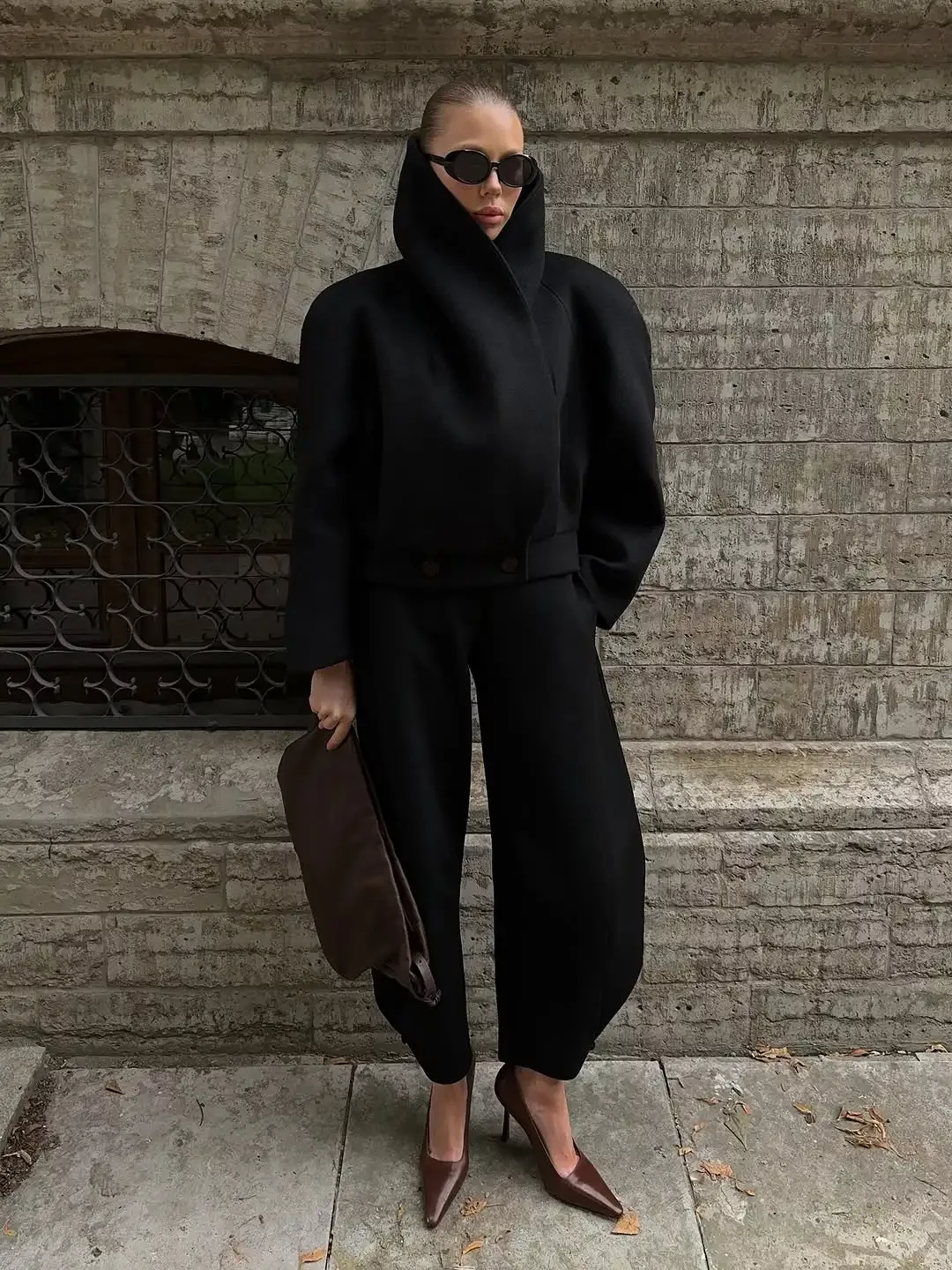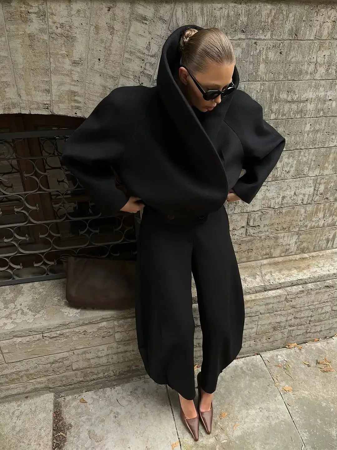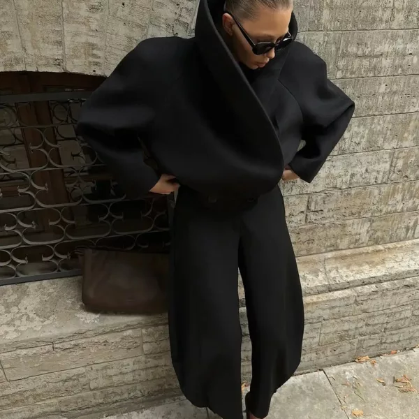 Some pieces don’t speak; they define. This Structured Black Sculptural Jacket does exactly that. Cut from a structured wool-blend fabric, it balances strength and precision through its architectural shape. The cropped silhouette meets a dramatic funnel collar, wrapping softly around the neck and framing the face with quiet intensity.