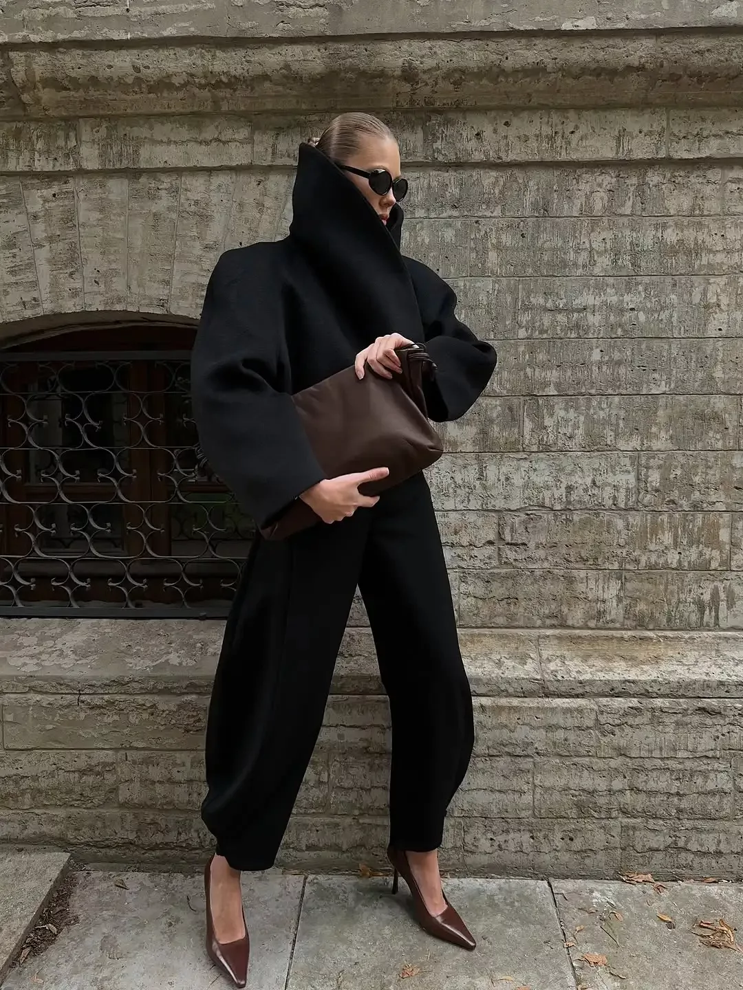 - Monochrome Classic: All-black layers with gold earrings and structured bag.