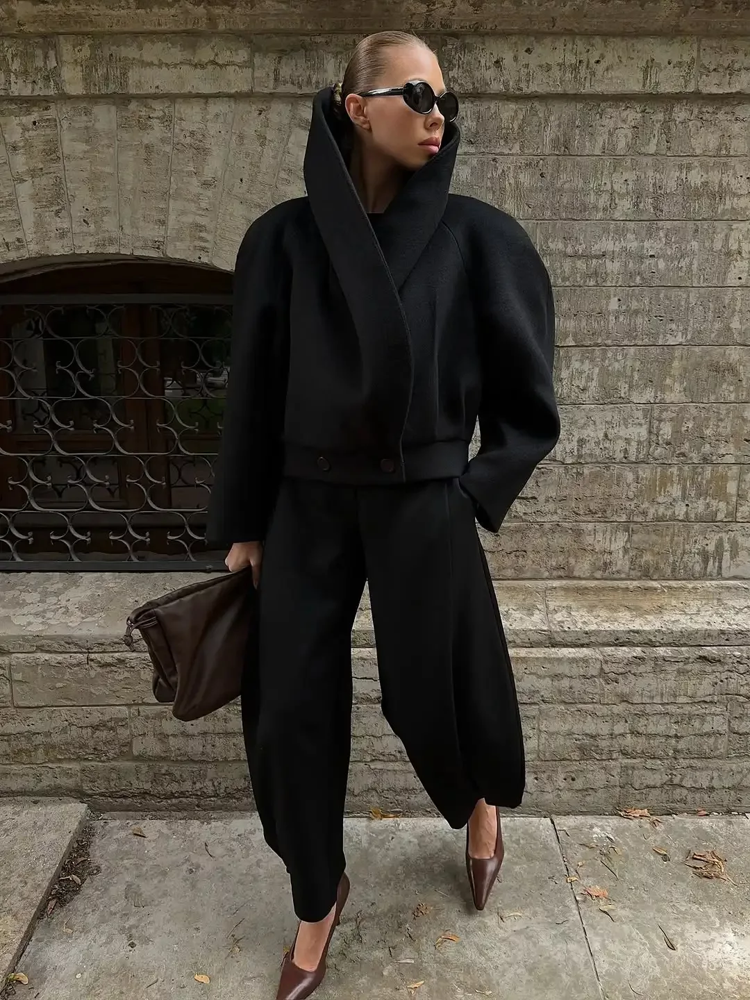 The design celebrates contrast. Exaggerated shoulders and curved sleeves bring controlled drama, while the cropped length and subtle waist detailing restore proportion. The result is modern armor, tailored but fluid, assertive yet elegant. The texture is matte and refined, creating depth without shine. Minimal buttons and clean seams keep the focus on form, not fuss.