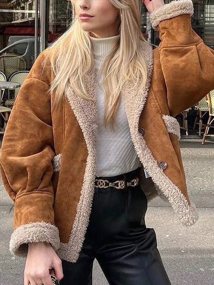Light Brown Oversized Teddy Borg Faux Suede Jacket with Button and Collar