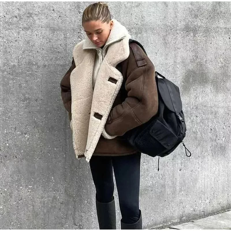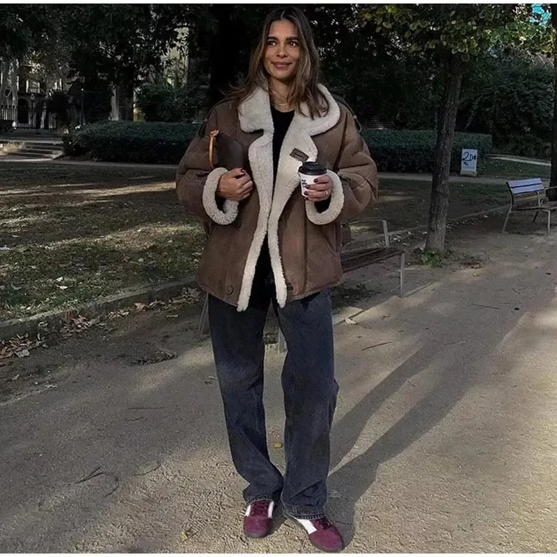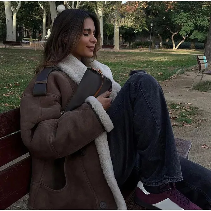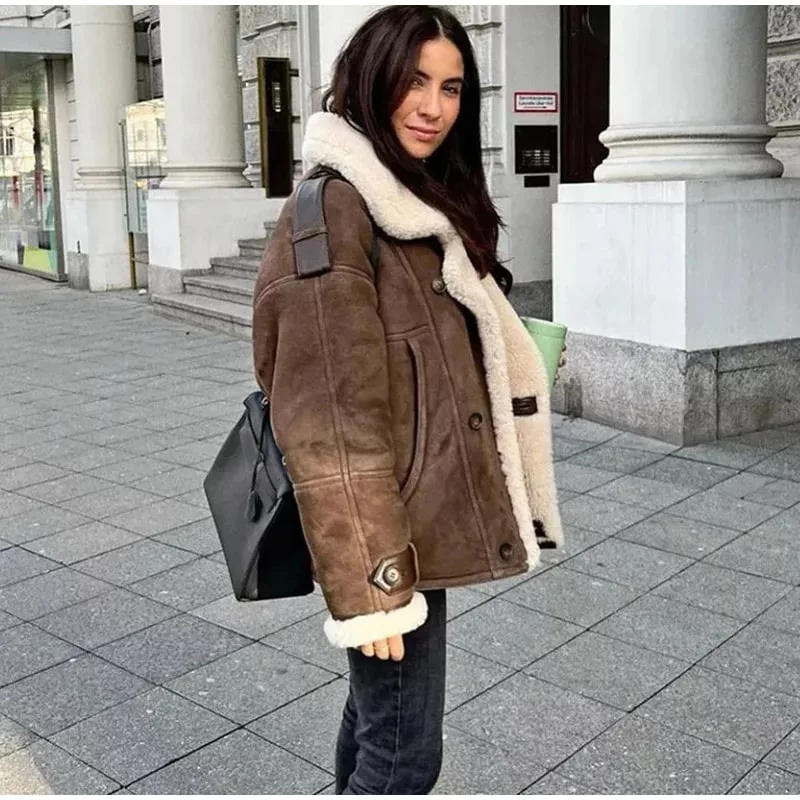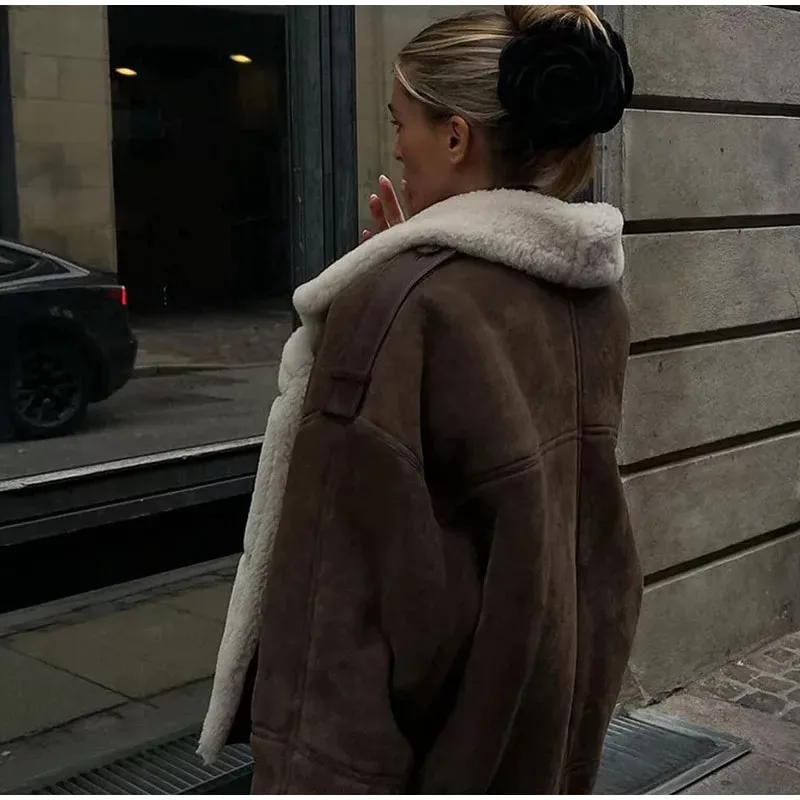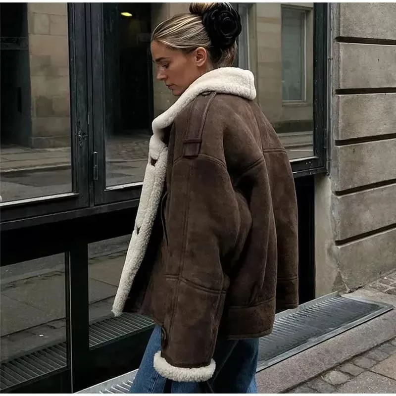 Vintage-inspired brown suede jacket with lamb wool lining, double-breasted details, and oversized shearling collar for cozy sophistication.