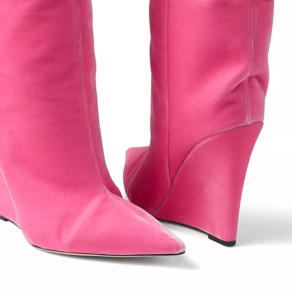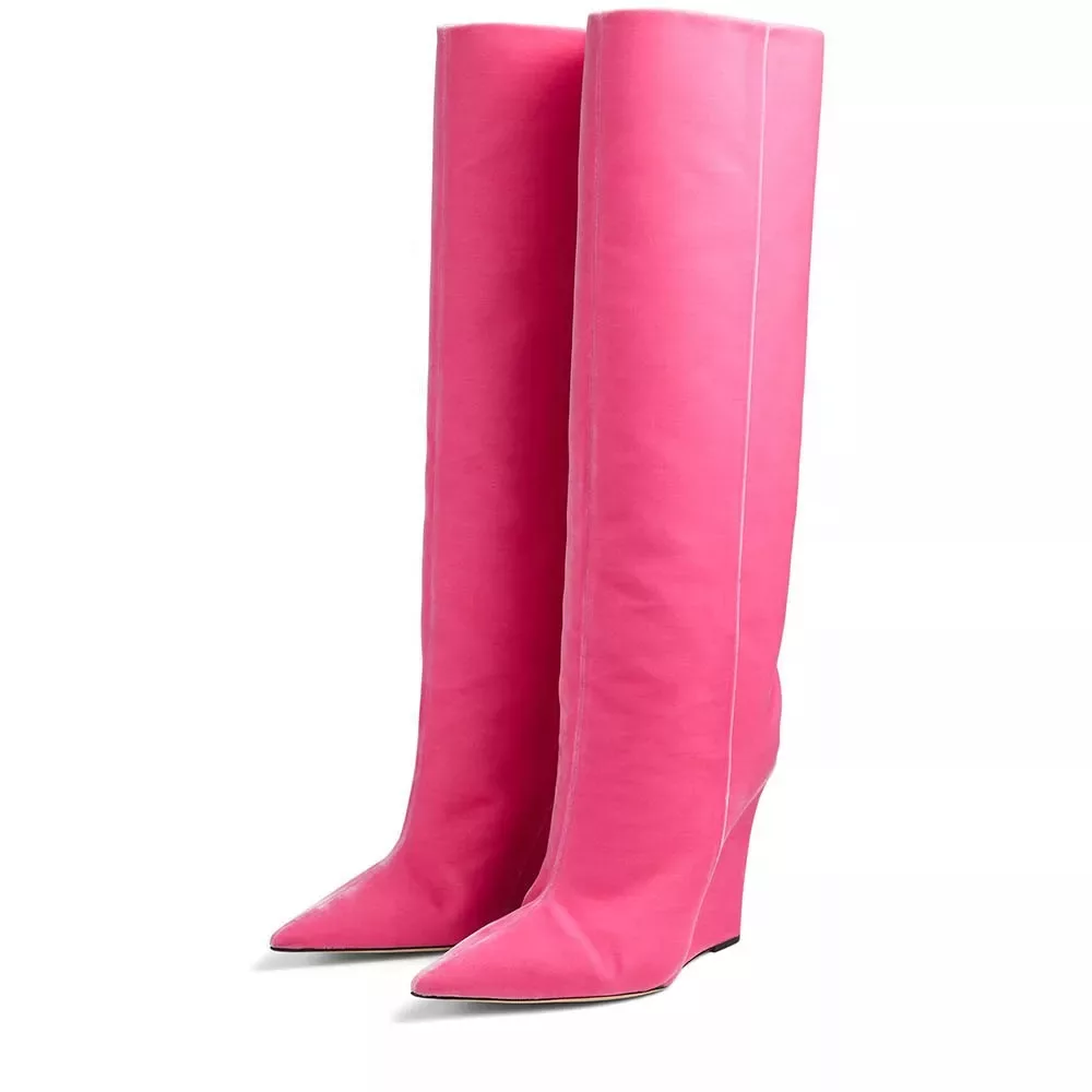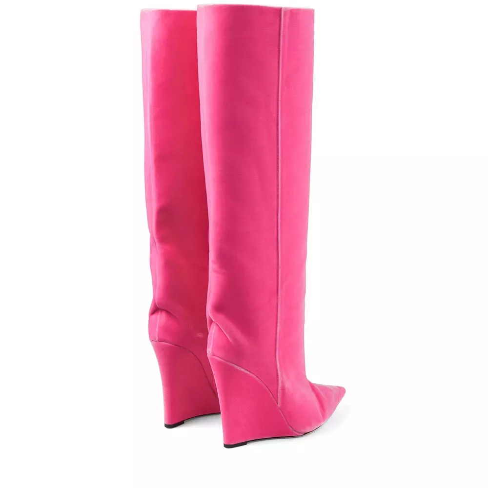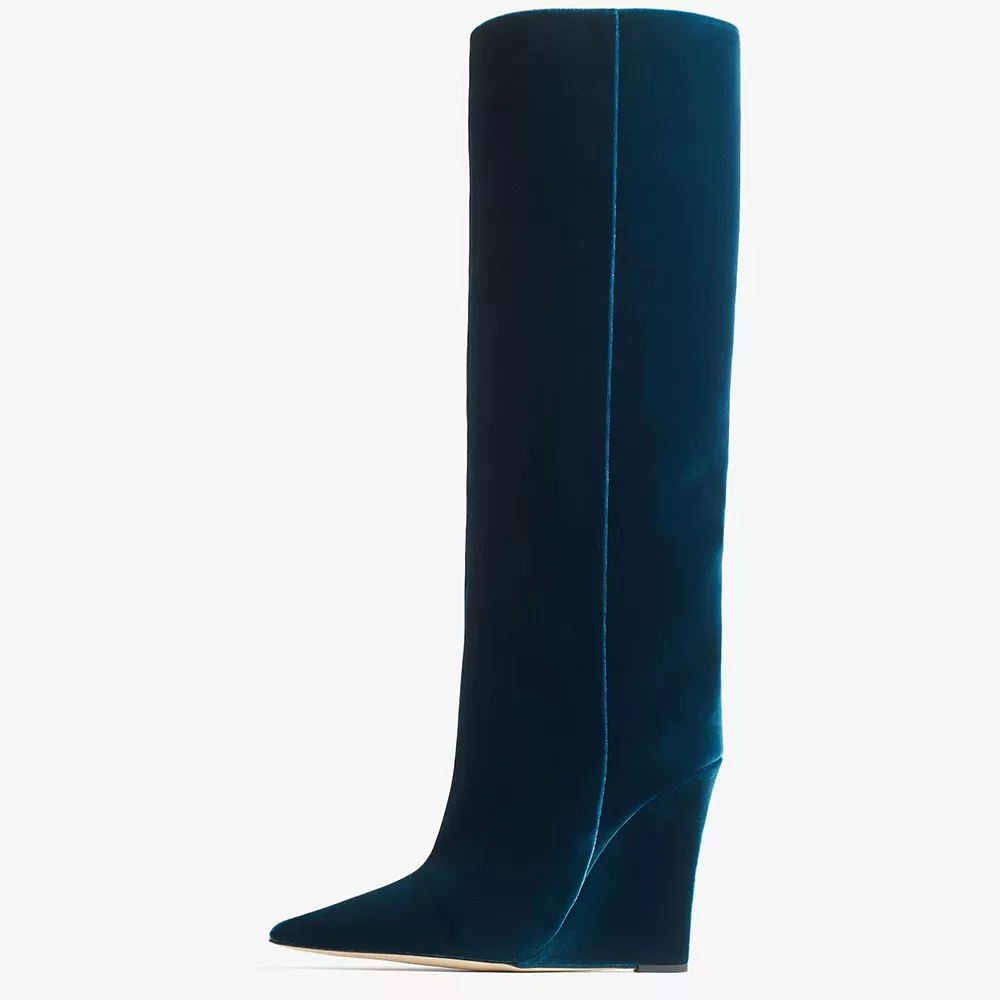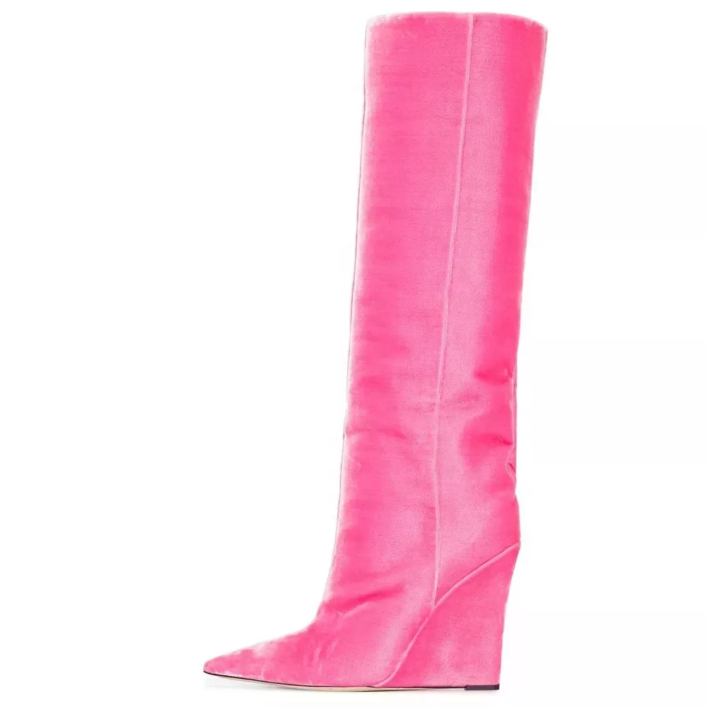 Elevate your wardrobe with these Wedge Heel Knee-High Boots, a true embodiment of elegance and luxury. Featuring a sophisticated mirrored wedge heel, these boots effortlessly blend high fashion with modern design. Crafted from sumptuous velvet fabric in striking shades of gold, silver, blue, and pink, they are the ultimate statement piece for any woman looking to add a touch of boldness to her ensemble. The sleek knee-high design elongates the leg, while the mirrored wedge heel provides an opulent finish that exudes confidence and style.
