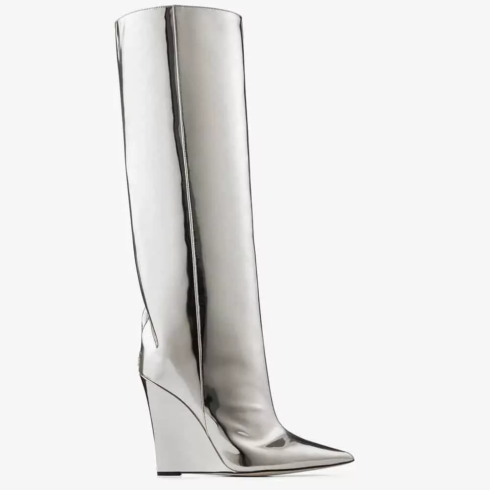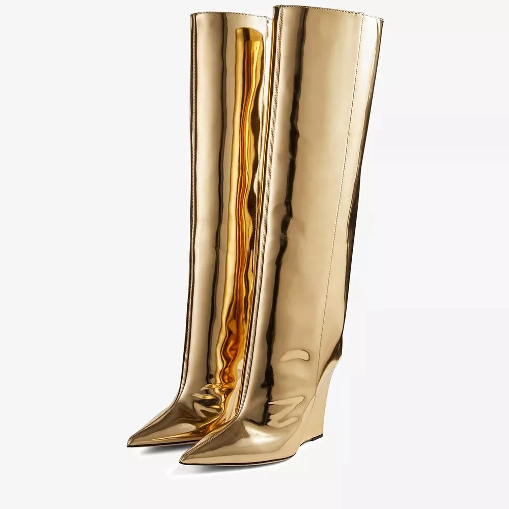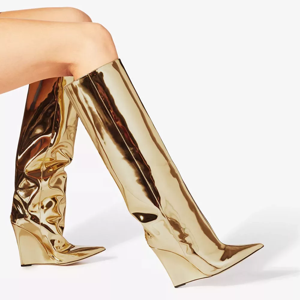 Knee-High Wedge-Heel Boots with Mirrored Finish